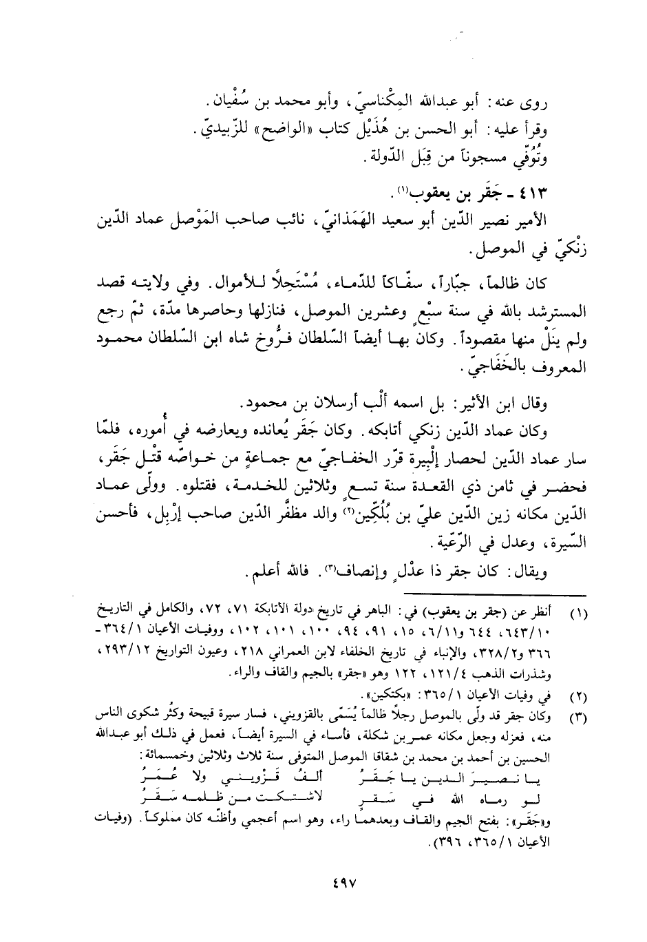 [1] انظر عن (جقر بن يعقوب) في: الباهر في تاريخ دولة الأتابكة 71، 72، والكامل في التاريخ 10/ 643، 644 و 11/ 6، 15، 91، 94، 100، 101، 102، ووفيات الأعيان 1/ 364- 366 و 2/ 328، والإنباء في تاريخ الخلفاء لابن العمراني 218، وعيون التواريخ 12/ 293، وشذرات الذهب 4/ 121، 122 وهو «جقر» بالجيم والقاف والراء.