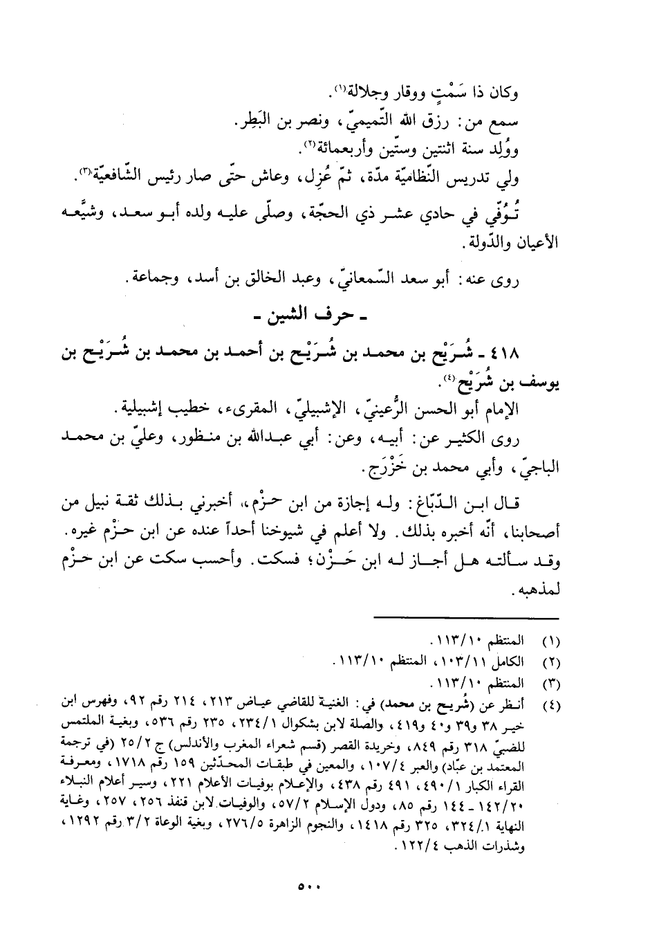 [4] انظر عن (شريح بن محمد) في: الغنية للقاضي عياض 213، 214 رقم 92، وفهرس ابن خير 38 و 39 و 40 و 419، والصلة لابن بشكوال 1/ 234، 235 رقم 536، وبغية الملتمس للضبيّ 318 رقم 849، وخريدة القصر (قسم شعراء المغرب والأندلس) ج 2/ 25 (في ترجمة المعتمد بن عبّاد) والعبر 4/ 107، والمعين في طبقات المحدّثين 159 رقم 1718، ومعرفة القراء الكبار 1/ 490، 491 رقم 438، والإعلام بوفيات الأعلام 221، وسير أعلام النبلاء 20/ 142- 144 رقم 85، ودول الإسلام 2/ 57، والوفيات لابن قنفذ 256، 257، وغاية النهاية 1/ 324، 325 رقم 1418، والنجوم الزاهرة 5/ 276، وبغية الوعاة 2/ 3 رقم 1292، وشذرات الذهب 4/ 122.