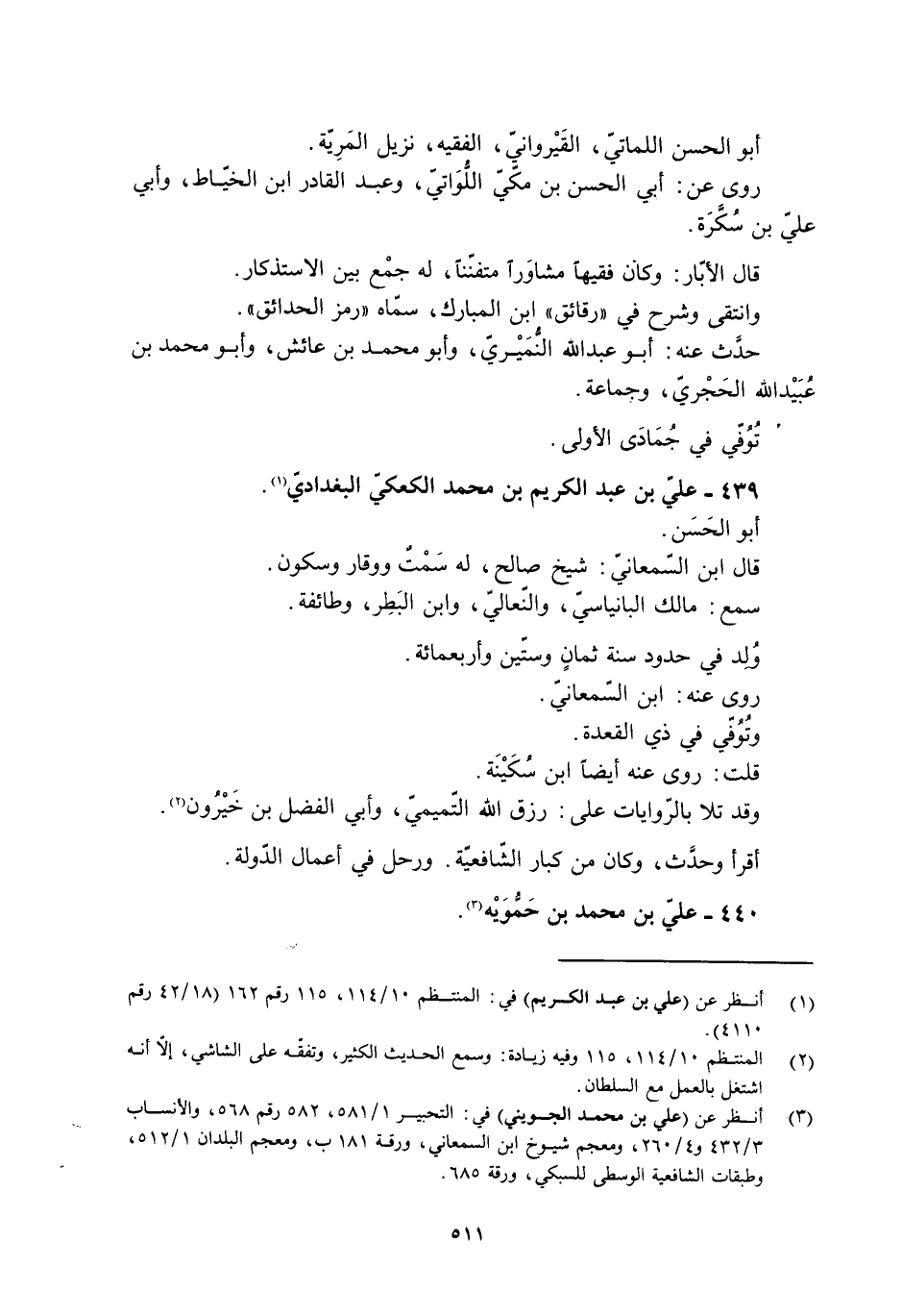 [1] انظر عن (علي بن عبد الكريم) في: المنتظم 10/ 114، 115 رقم 162 (18/ 42 رقم 4110) .