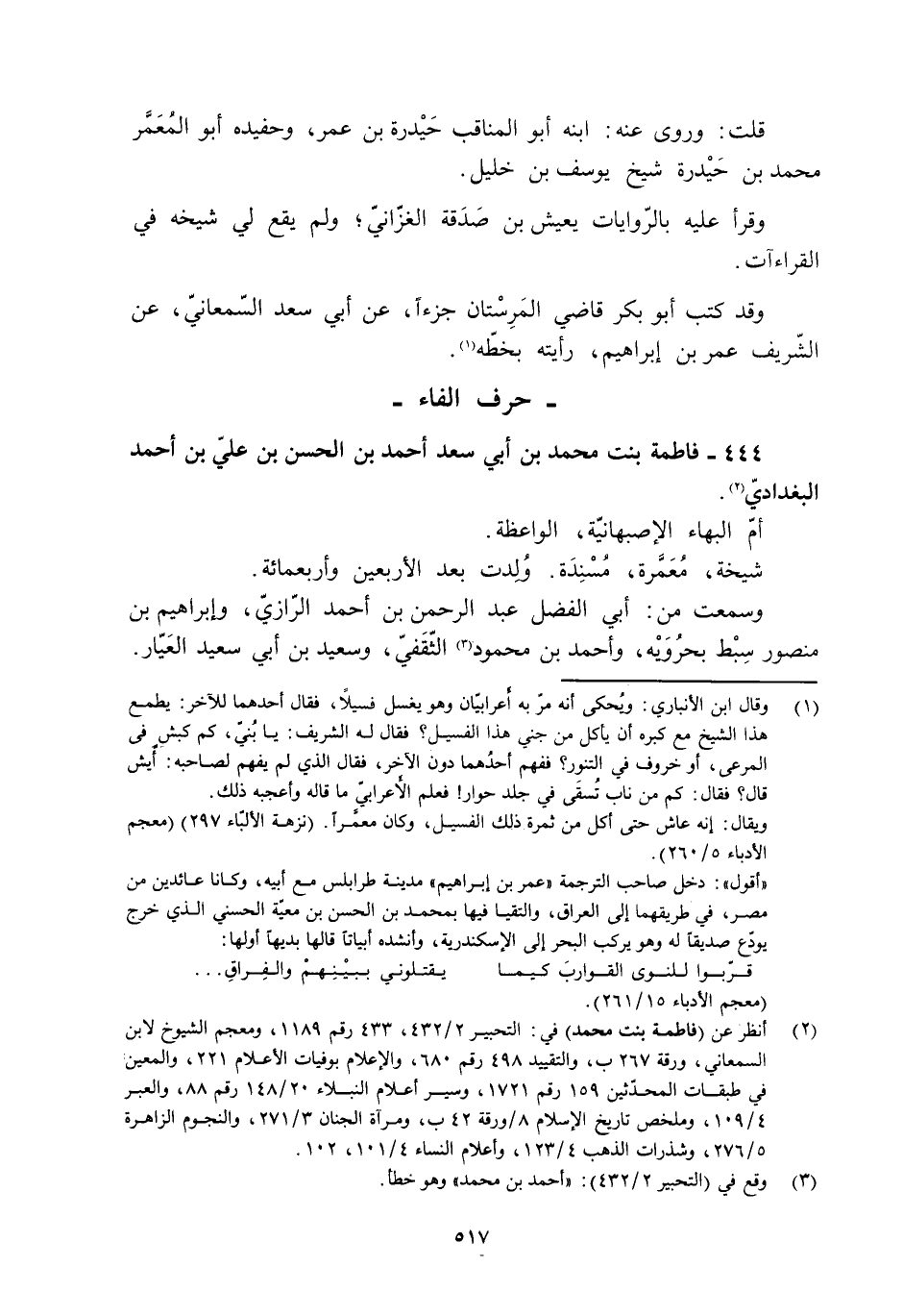 444- فاطمة بنت محمد بن أبي سعْد أَحْمَد بْن الحَسَن بْن عليّ بْن أَحْمَد البغداديّ [2] .