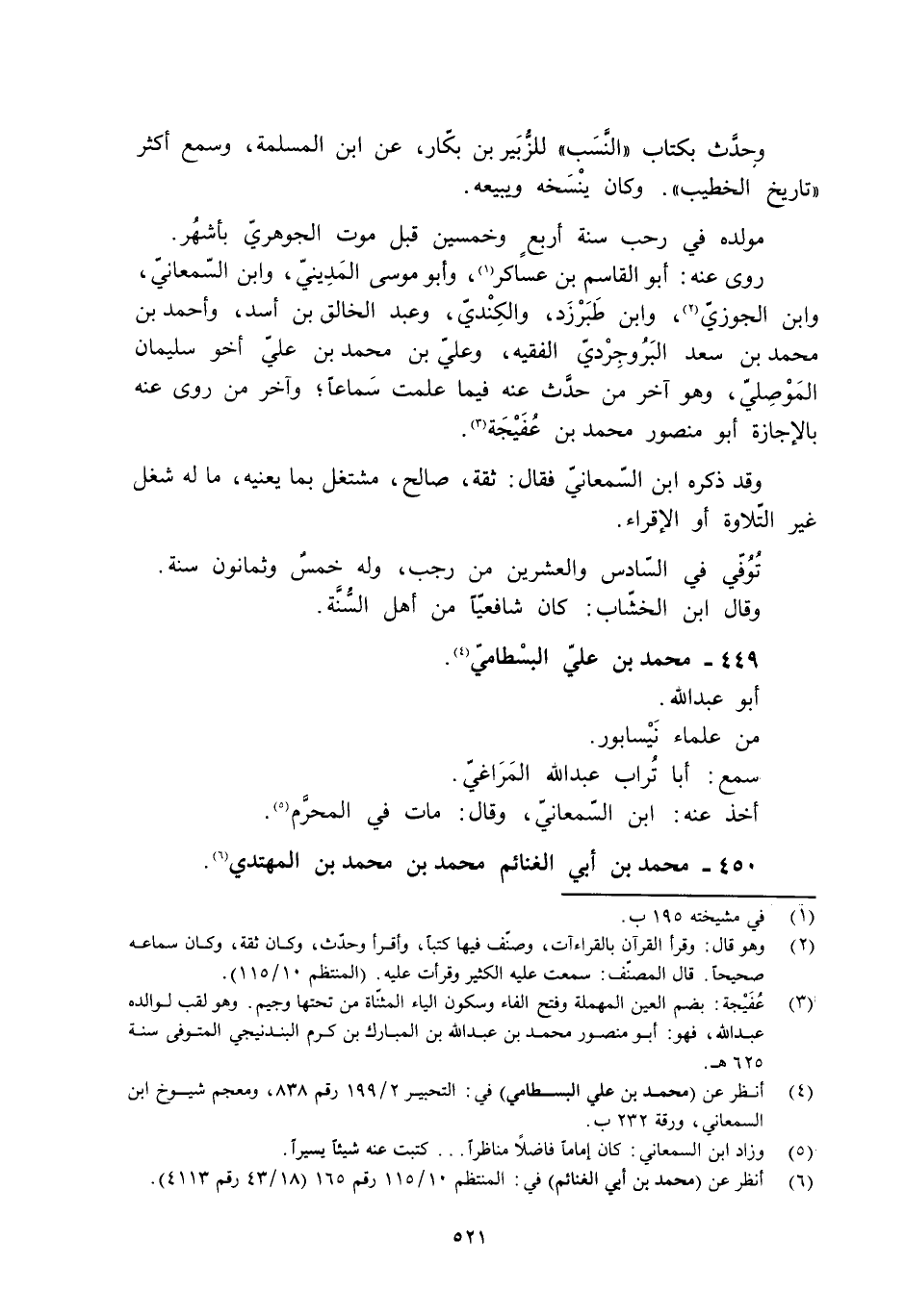 [4] انظر عن (محمد بن علي البسطامي) في: التحبير 2/ 199 رقم 838، ومعجم شيوخ ابن السمعاني، ورقة 232 ب.