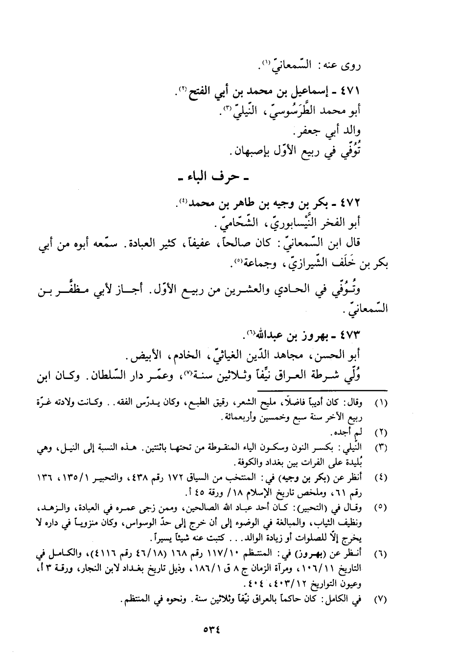 [6] انظر عن (بهروز) في: المنتظم 10/ 117 رقم 168 (18/ 46 رقم 4116) ، والكامل في التاريخ 11/ 106، ومرآة الزمان ج 8 ق 1/ 186، وذيل تاريخ بغداد لابن النجار، ورقة 3 أ، وعيون التواريخ 12/ 403، 404.