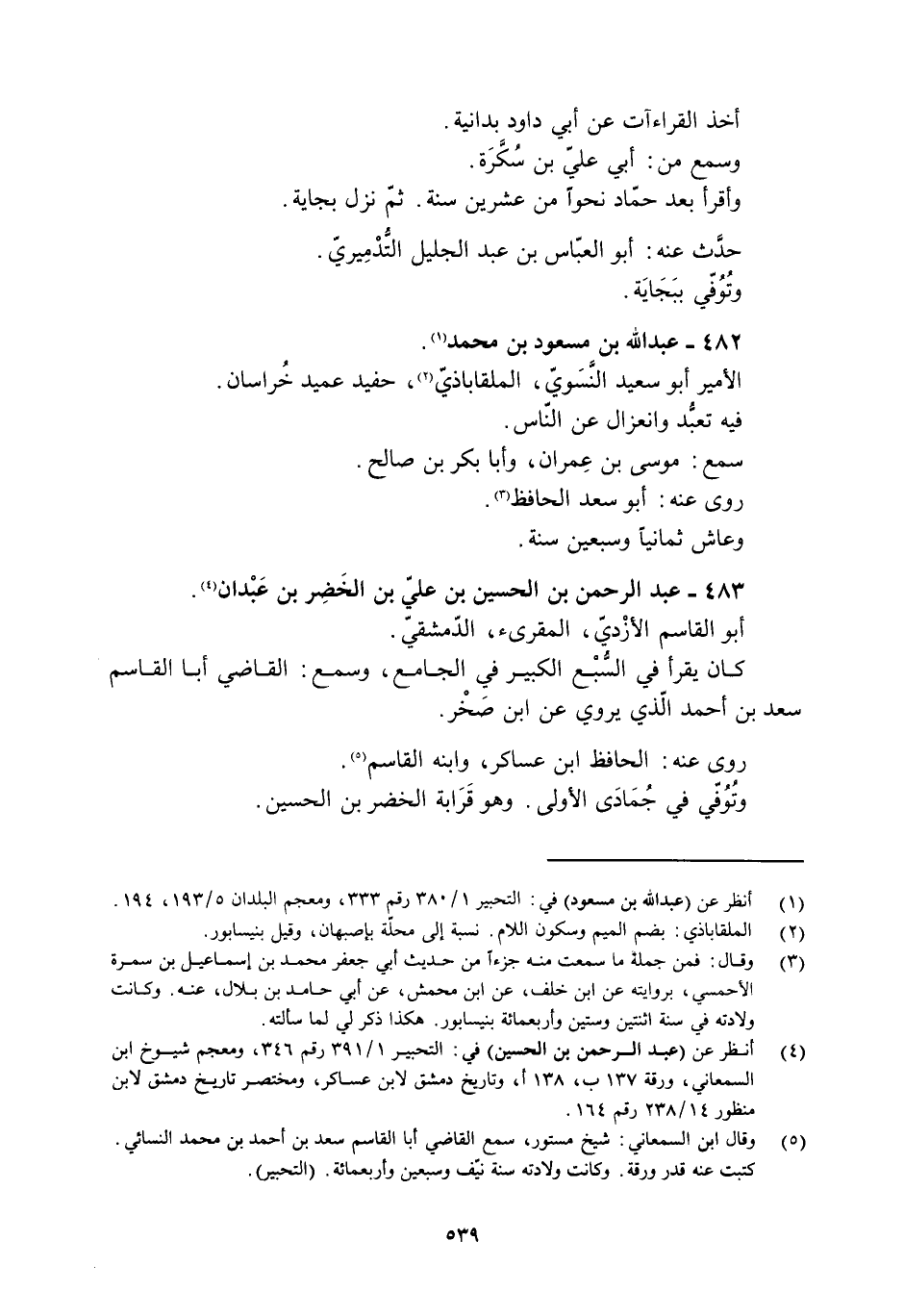 [4] انظر عن (عبد الرحمن بن الحسين) في: التحبير 1/ 391 رقم 346، ومعجم شيوخ ابن السمعاني، ورقة 137 ب، 138 أ، وتاريخ دمشق لابن عساكر، ومختصر تاريخ دمشق لابن منظور 14/ 238 رقم 164.