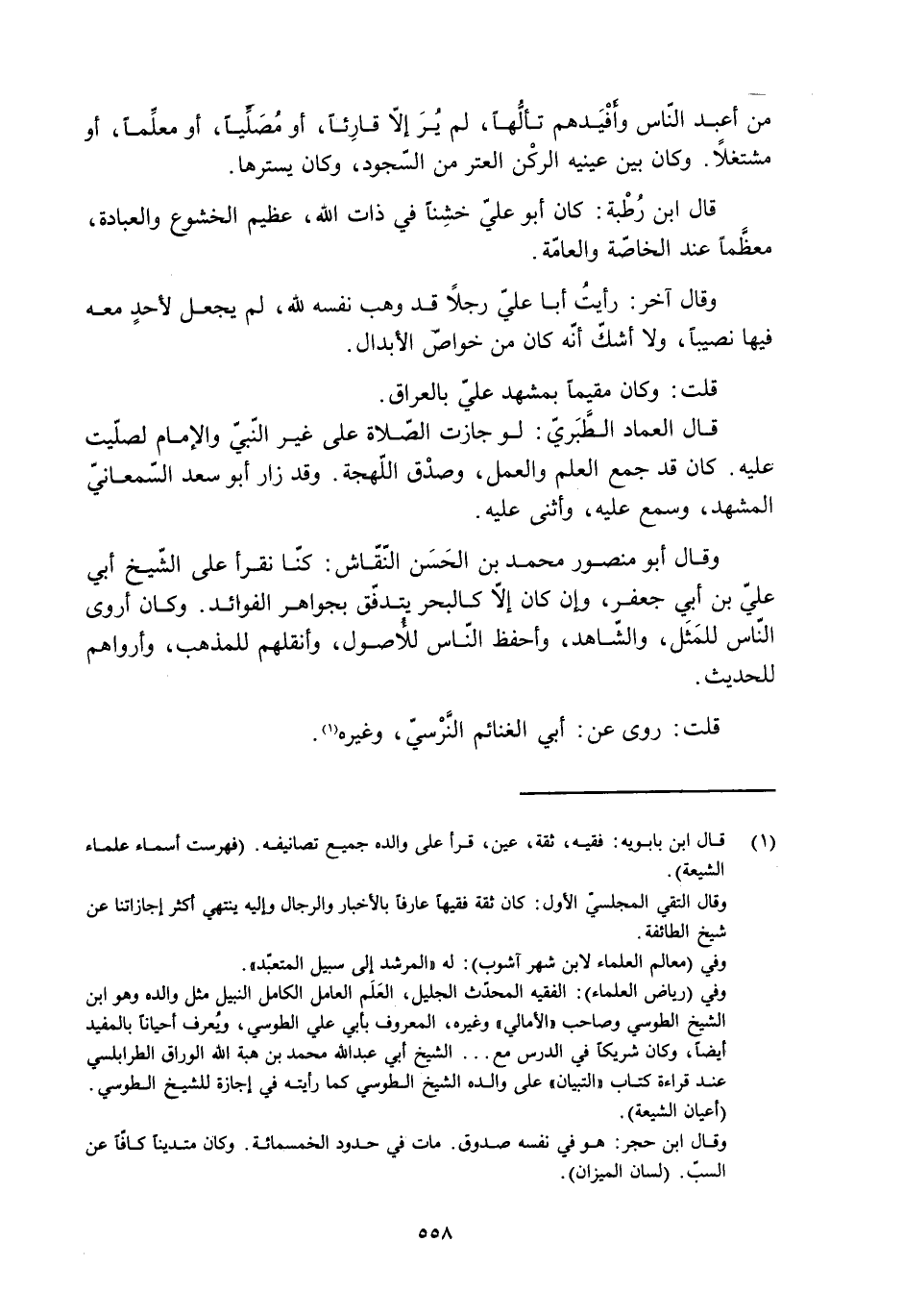 وفي (رياض العلماء) : الفقيه المحدّث الجليل، العلم العامل الكامل النبيل مثل والده وهو ابن الشيخ الطوسي وصاحب «الأمالي» وغيره، المعروف بأبي علي الطوسي، ويعرف أحيانا بالمفيد أيضا، وكان شريكا في الدرس مع ... الشيخ أَبِي عَبْد الله مُحَمَّد بْن هبة الله الوراق الطرابلسي عند قراءة كتاب «التبيان» على والده الشيخ الطوسي كما رأيته في إجازة للشيخ الطوسي.