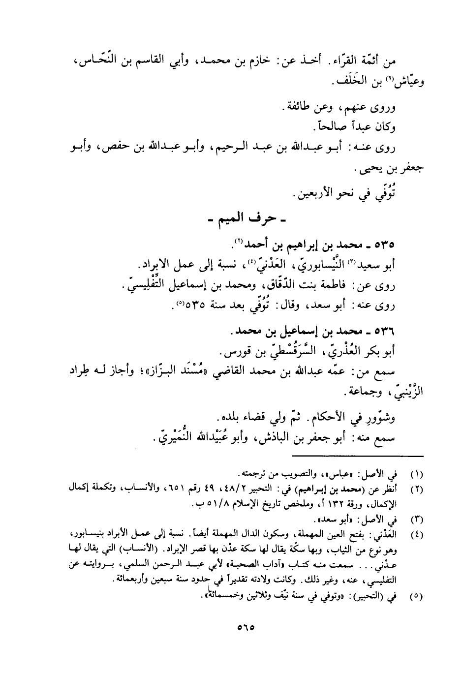 [2] انظر عن (محمد بن إبراهيم) في: التحبير 2/ 48، 49 رقم 651، والأنساب، وتكملة إكمال الإكمال، ورقة 132 أ، وملخص تاريخ الإسلام 8/ 51 ب.