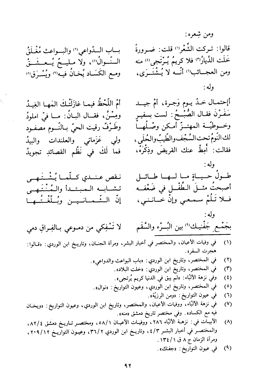 [8] الأبيات في: نزهة الألبّاء 286، ووفيات الأعيان 1/ 58، ومختصر تاريخ دمشق 4/ 82، والمختصر في أخبار البشر 3/ 4، وتاريخ ابن الوردي 2/ 36، وعيون التواريخ 12/ 209، ومرآة الزمان ج 8 ق 1/ 134.