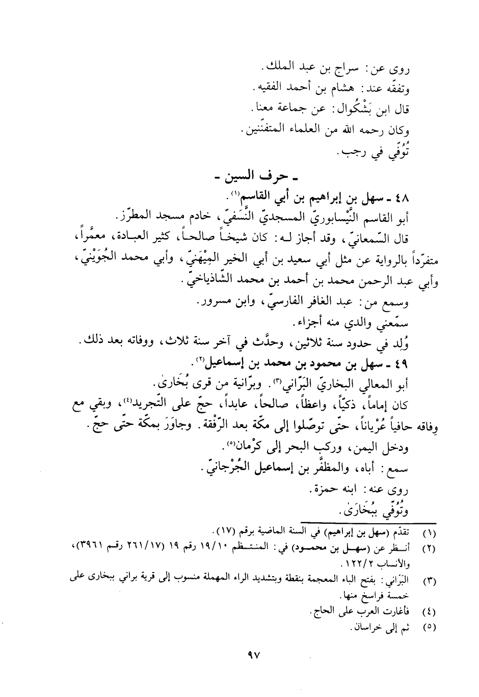 [3] البراني: بفتح الباء المعجمة بنقطة وبتشديد الراء المهملة منسوب إلى قرية براني ببخارى على خمسة فراسخ منها.