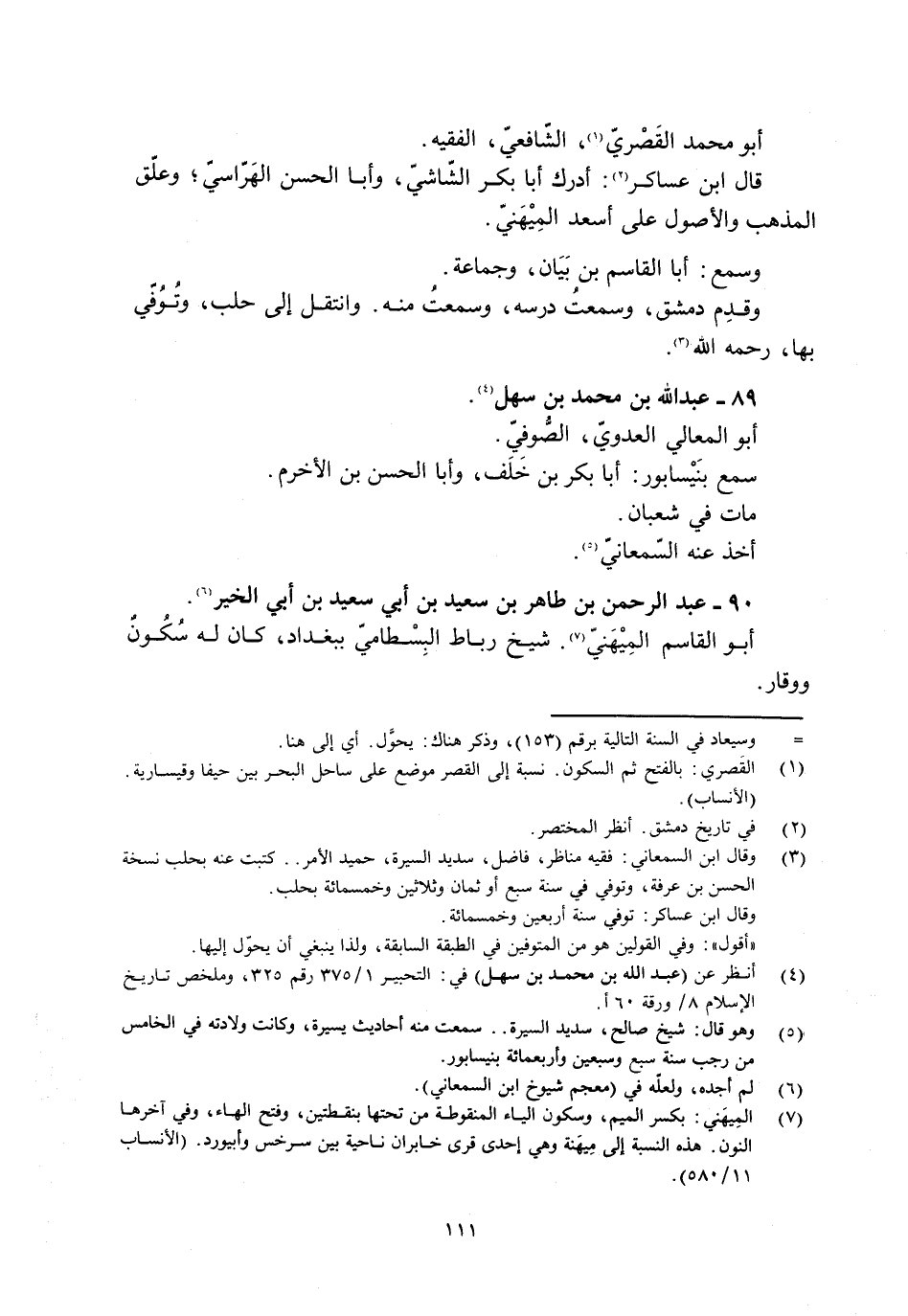 [4] انظر عن (عبد الله بن محمد بن سهل) في التحبير 1/ 375 رقم 325، وملخص تاريخ الإسلام 8/ ورقة 60 أ.