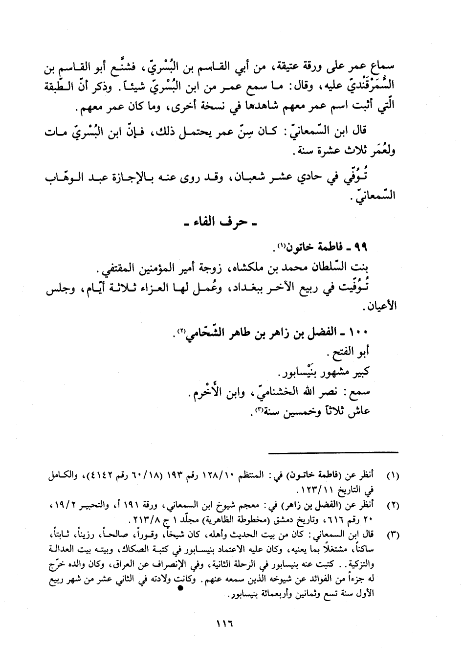 [2] انظر عن (الفضل بن زاهر) في: معجم شيوخ ابن السمعاني، ورقة 191 أ، والتحبير 2/ 19، 20 رقم 616، وتاريخ دمشق (مخطوطة الطاهرية) مجلّد 1 ج 8/ 213.