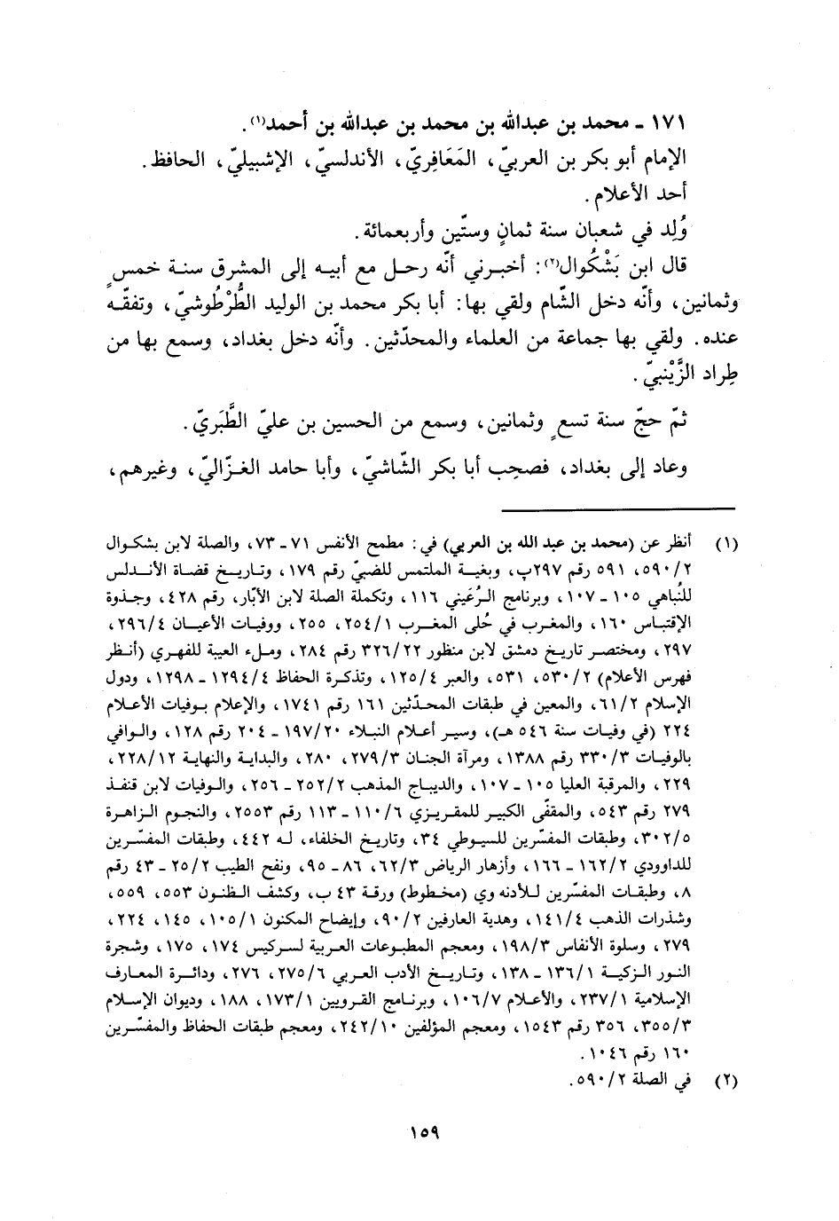 [1] انظر عن (محمد بن عبد الله بن العربيّ) في: مطمح الأنفس 71- 73، والصلة لابن بشكوال 2/ 590، 591 رقم 297 پ، وبغية الملتمس للضبيّ رقم 179، وتاريخ قضاة الأندلس للنباهي 105- 107، وبرنامج الرعينيّ 116، وتكملة الصلة لابن الأبّار، رقم 428، وجذوة الاقتباس 160، والمغرب في حلى المغرب 1/ 254، 255، ووفيات الأعيان 4/ 296، 297، ومختصر تاريخ دمشق لابن منظور 22/ 326 رقم 284، وملء العيبة للفهري (انظر فهرس الأعلام) 2/ 530، 531، والعبر 4/ 125، وتذكرة الحفاظ 4/ 1294- 1298، ودول الإسلام 2/ 61، والمعين في طبقات المحدّثين 161 رقم 1741، والإعلام بوفيات الأعلام 224 (في وفيات سنة 546 هـ) ، وسير أعلام النبلاء 20/ 197- 204 رقم 128، والوافي بالوفيات 3/ 330 رقم 1388، ومرآة الجنان 3/ 279، 280، والبداية والنهاية 12/ 228، 229، والمرقبة العليا 105- 107، والديباج المذهب 2/ 252- 256، والوفيات لابن قنفذ 279 رقم 543، والمقفّى الكبير للمقريزي 6/ 110- 113 رقم 2553، والنجوم الزاهرة 5/ 302، وطبقات المفسّرين للسيوطي 34، وتاريخ الخلفاء، له 442، وطبقات المفسّرين للداوديّ 2/ 162- 166، وأزهار الرياض 3/ 62، 86- 95، ونفخ الطيب 2/ 25- 43 رقم 8، وطبقات المفسّرين للأدنه وي (مخطوط) ورقة 43 ب، وكشف الظنون 553، 559، وشذرات الذهب 4/ 141، وهدية العارفين 2/ 90، وإيضاح المكنون 1/ 105، 145، 224، 279، وسلوة الأنفاس 3/ 198، ومعجم المطبوعات العربية لسركيس 174، 175، وشجرة النور الزكية 1/ 136- 138، وتاريخ الأدب العربيّ 6/ 275، 276، ودائرة المعارف الإسلامية 1/ 237، والأعلام 7/ 106، وبرنامج القرويين 1/ 173، 188، وديوان الإسلام 3/ 355، 356، رقم 1543، ومعجم المؤلفين 10/ 242، ومعجم طبقات الحفاظ والمفسّرين 160 رقم 1046.