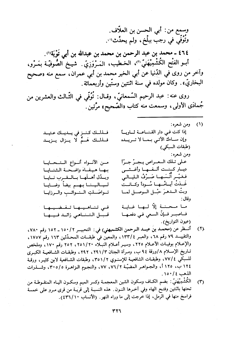 [3] الكشميهنيّ: بضم الكاف وسكون الشين المعجمة وكسر الميم وسكون الياء المنقوطة من تحتها باثنتين وفتح الهاء وفي آخرها النون. هذه النسبة إلى قرية من قرى مرو على خمسة فراسخ منها في الرمل، إذا خرجت إلى ما وراء النهر. (الأنساب 10/ 436) .