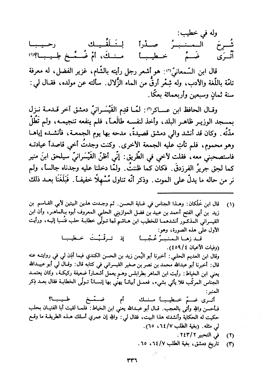 [1] قال ابن خلّكان: وهذا الجناس في غاية الحسن. ثم وجدت هذين البيتين لأبي القاسم بن زيد بن أبي الفتح أحمد بن عبيد بن فضل الموازيني الحلبي المعروف أبوه بالماهر، وأن ابن القيسراني المذكور أنشدهما للخطيب ابن هاشم لما تولّى خطابة حلب فنسبا إليه، ورأيت الأول على هذه الصورة، وهو: