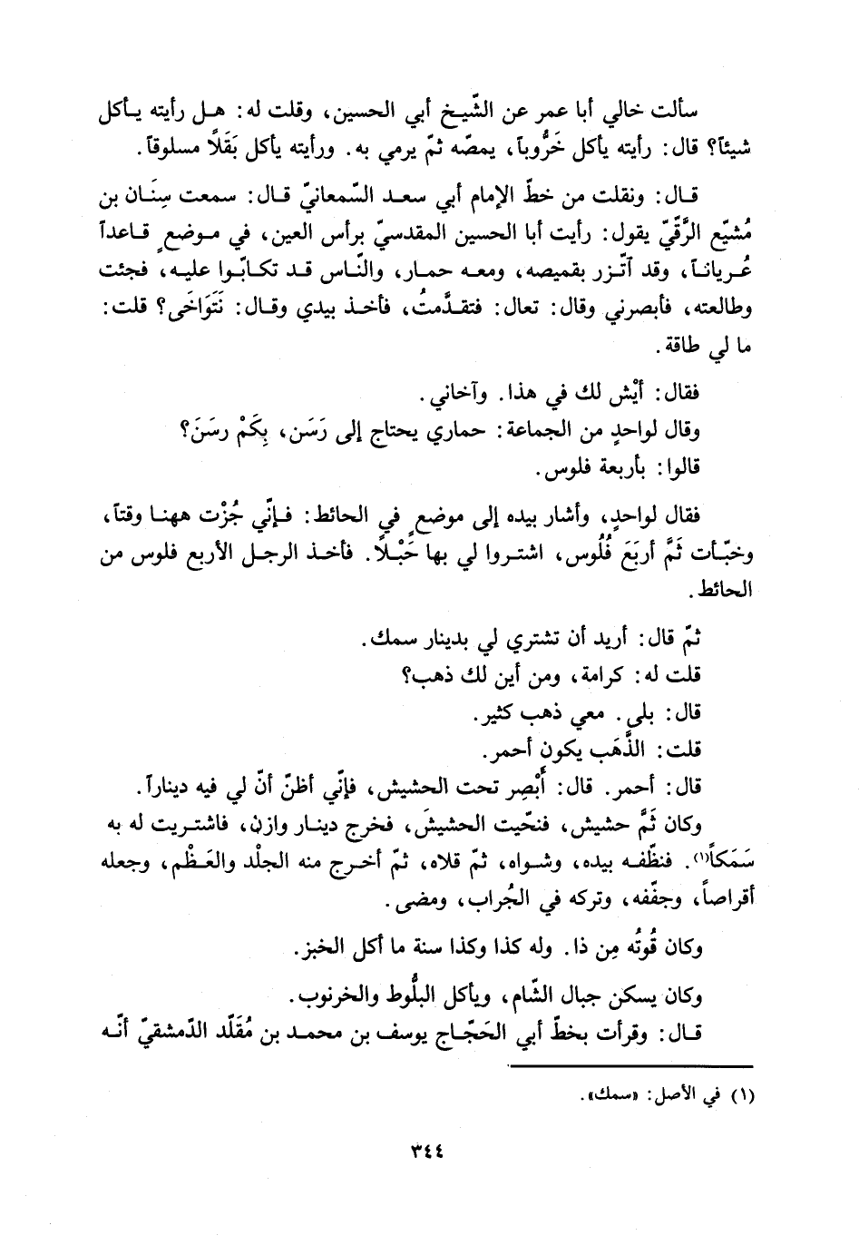 وكان ثمَّ حشيش، فنحّيت الحشيشَ، فخرج دينار وازن، فاشتريت لَهُ بِهِ سَمَكًا [1] . فنظّفه بيده، وشواه، ثمّ قلاه، ثمّ أخرج منه الجلْد والعَظْم، وجعله أقراصا، وجفّفه، وتركه في الْجُراب، ومضى.