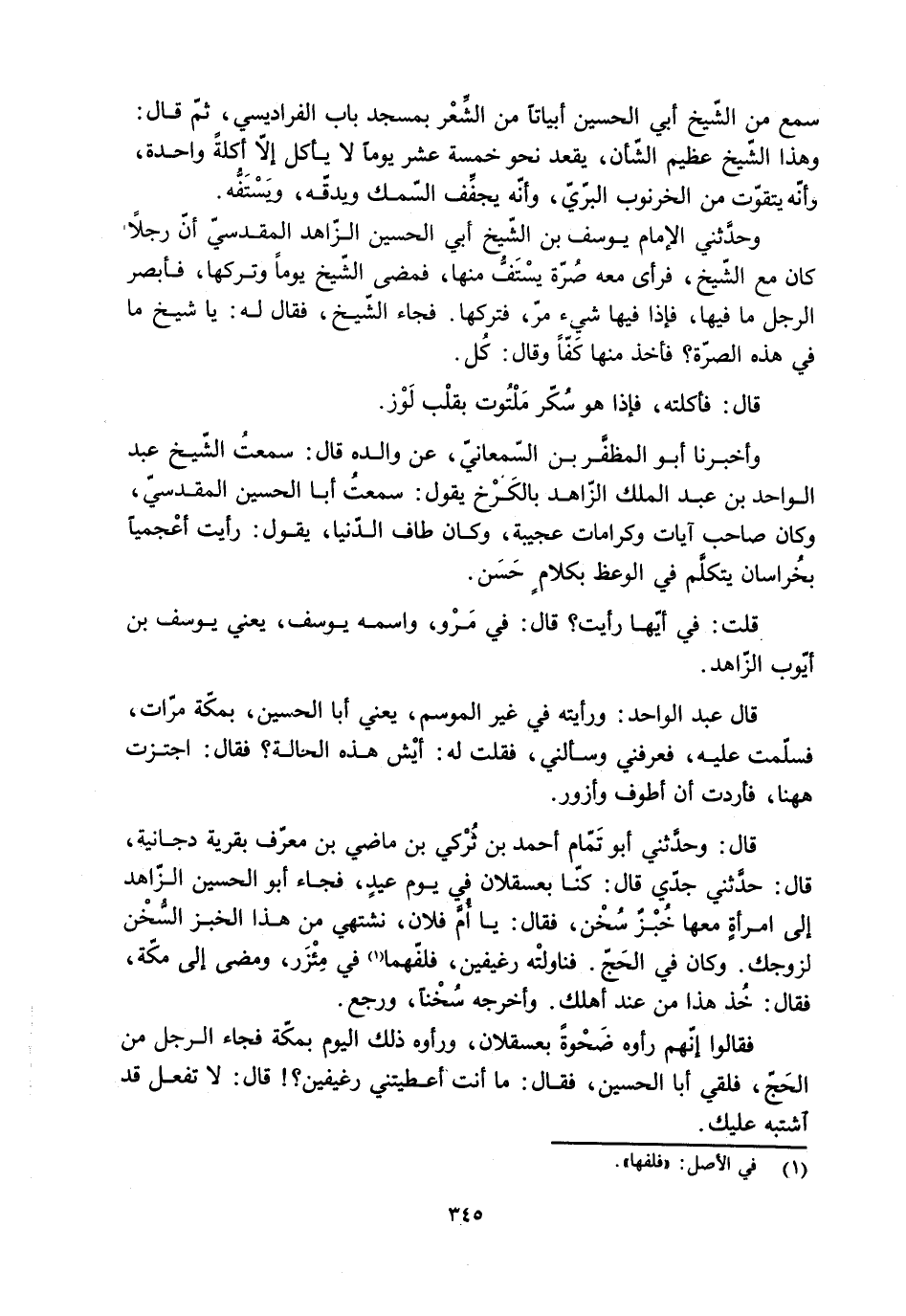 وَأَخْبَرَنَا أبو المظفَّر بْن السّمعانيّ، عَنْ والده قَالَ: سمعتُ الشّيخ عبد الواحد بْن عبد الملك الزّاهد بالكَرْخ يَقُولُ: سمعتُ أبا الحسين المقدسيّ، وكان صاحب آيات وكرامات عجيبة، وكان طاف الدّنيا، يَقُولُ: رَأَيْت أعْجميًا بخُراسان يتكلَّم في الوعظ بكلامٍ حَسَن.