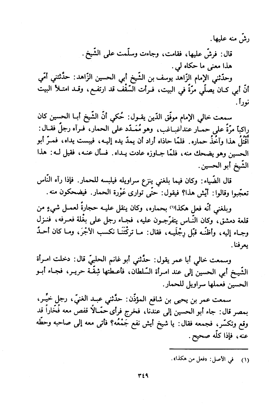 وسمعت خالي أبا عُمَر يَقُولُ: حدَّثني أبو غانم الحلبيّ قَالَ: دخلت امْرَأَة الشّيخ أَبِي الحسين إلى عند امْرَأَة السّلطان، فأعطتها شِقَّة حرير، فجاء أبو الحسين فعملها سراويل للحمار.