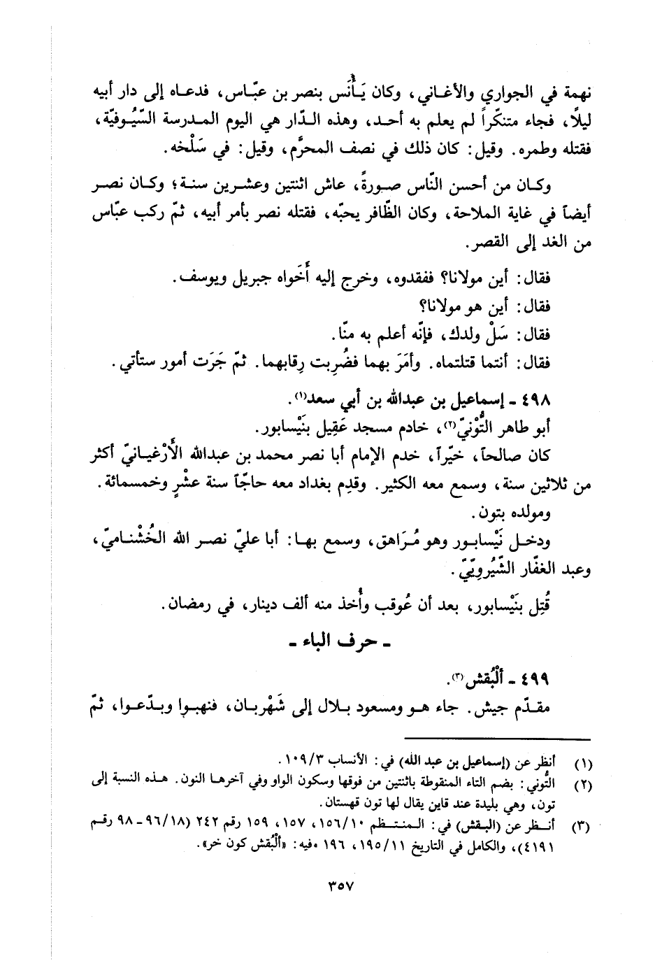 [3] انظر عن (البقش) في: المنتظم 10/ 156، 157، 159، رقم 242 (18/ 96- 98 رقم 4191) ، والكامل في التاريخ 11/ 195، 196 وفيه: «ألبقش كون خر» .