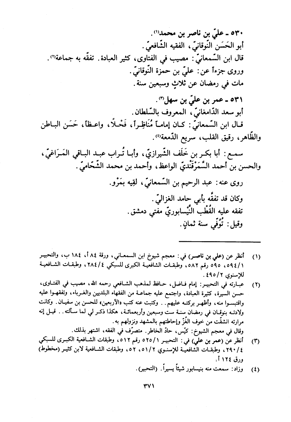 [2] عبارته في التحبير: إمام فاضل، حافظ لمذهب الشافعيّ رحمه الله، مصيب في الفتاوى، حسن السيرة، كثيرة العبادة، واجتمع عليه جماعة من الفقهاء البلديين والغرباء، وتفقهوا عليه واقتبسوا منه، وأظهر بركته عليهم.. وكتبت عنه كتب «الأربعين» للحسن بن سفيان. وكانت ولادته بنوقان في رمضان سنة ست وسبعين وأربعمائة، هكذا ذكر لي لما سألته.. قيل إنه مرارته انشقّت من خوف الغزّ وإحاطتهم بالمشهد ونزولهم به.