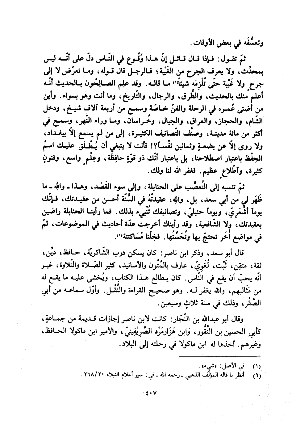 ثمّ تَقُولُ: فإذا قال قائل إن هذا وقوع في الناس دلّ عَلَى أنّه لَيْسَ بمحدِّث، ولا يعرف الجرح من الغَيْبة، فالرجل قَالَ قوله، وما تعرّض لا إلى جرحٍ ولا غَيْبة حتّى تُلْزِمَه شيئا [1] ما قاله. وقد علِم الصالِحُون بالحديث أنّه أعلم منك بالحديث، والطُّرق، والرجال، والتّاريخ، وما أنت وهو بسواء. وأين من أضنى عُمره في الرحلة والفنّ خاصَّة وسمع من أربعة آلاف شيخ، ودخل الشّام، والحجاز، والعراق، والجبال، وخُراسان، وما وراء النّهر، وسمع في أكثر من مائة مدينة، وصنَّف التّصانيف الكثيرة، إلى من لم يسمع إلّا ببغداد، ولا روى إلّا عَنْ بضعةٍ وثمانين نفْسًا؟! فأنت لا ينبغي أن يُطْلَق عليك اسمُ الحِفْظ باعتبار اصطلاحنا، بل باعتبار أنّك ذو قوَّةٍ حافِظَة، وعلْمٍ واسع، وفنون كثيرة، واطّلاعٍ عظيم. فغفر اللَّه لنا ولك.