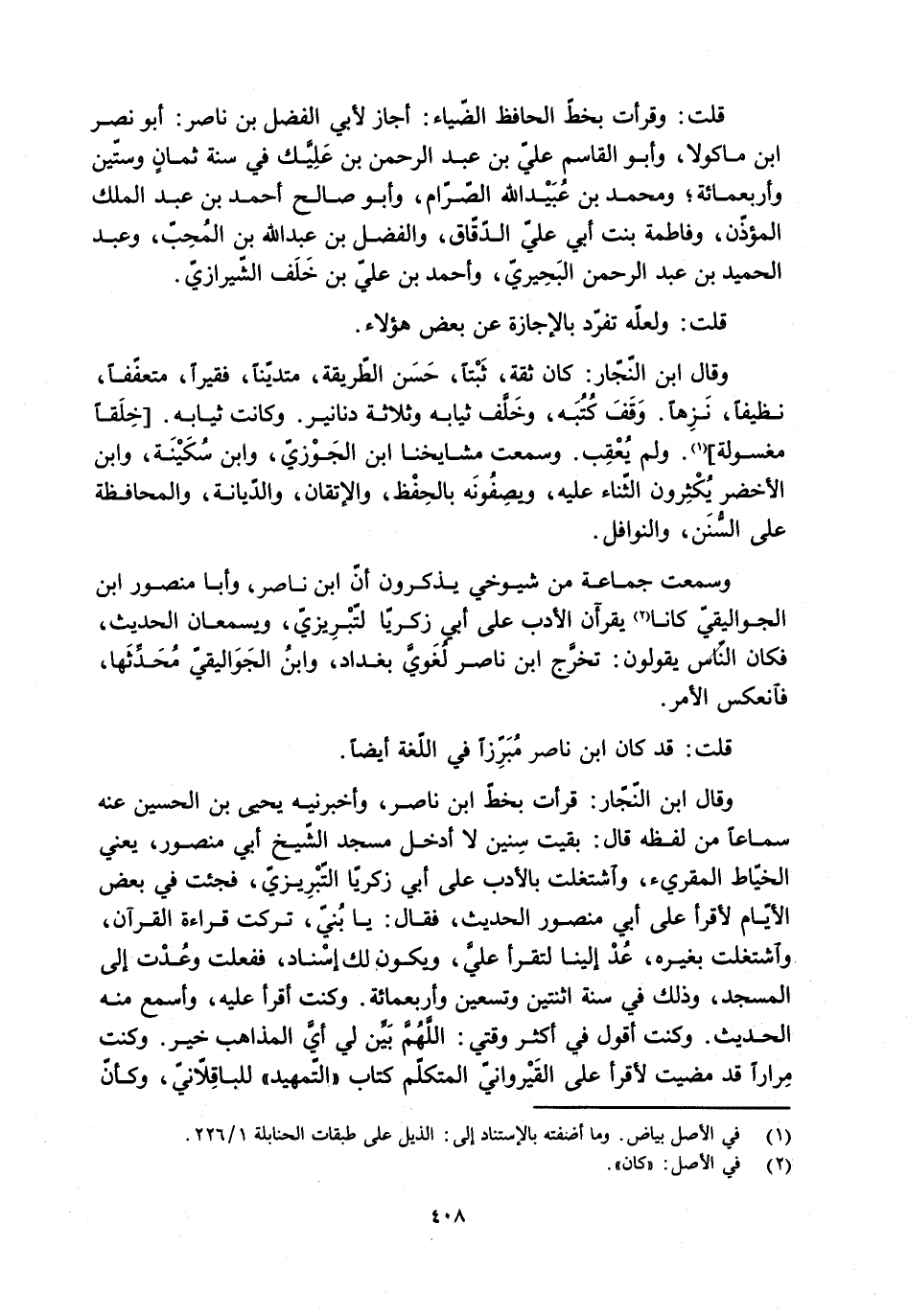 وسمعت جماعة من شيوخي يذكرون أنّ ابن ناصر، وأبا منصور ابن الجواليقيّ كانا [2] يقرءان الأدب على أبي زكريّا التّبريزيّ، ويسمعان الحديث، فكان النّاس يقولون: تخرَّج ابن ناصر لُغَوِيَّ بغداد، وابنُ الْجَوَاليقيّ مُحَدِّثَها، فانعكس الأمر.