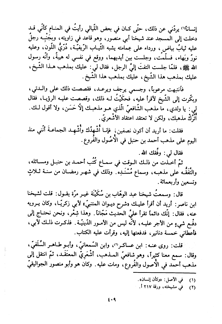 إنسانا [1] يردّني عَنْ ذَلكَ، حتّى كَانَ في بعض اللّيالي رأيتُ في المنام كأنّي قد دخلت إلى المسجد عند شيخنا أَبِي منصور، وهو قاعد في زاويته، وبجَنْبِه رجلٌ عَلَيْهِ ثيابُ بياضٍ، ورداء عَلَى عِمامته يشبه الثّياب الرّيفيَّة، دُرّيُّ اللّون، وعليه نورٌ وبَهاء، فسلّمت، وجلست بين أيديهما، ووقع في نفسي لَهُ هيبةٌ، وأنّه رسول الله صَلَّى اللَّهُ عَلَيْهِ وَسَلَّمَ، فلما جلست التفتَ إليَّ الرجل، فقال لي: عليك بمذهب هذا الشّيخ، عليك بمذهب هذا الشّيخ، عليك بمذهب هذا الشّيخ.
