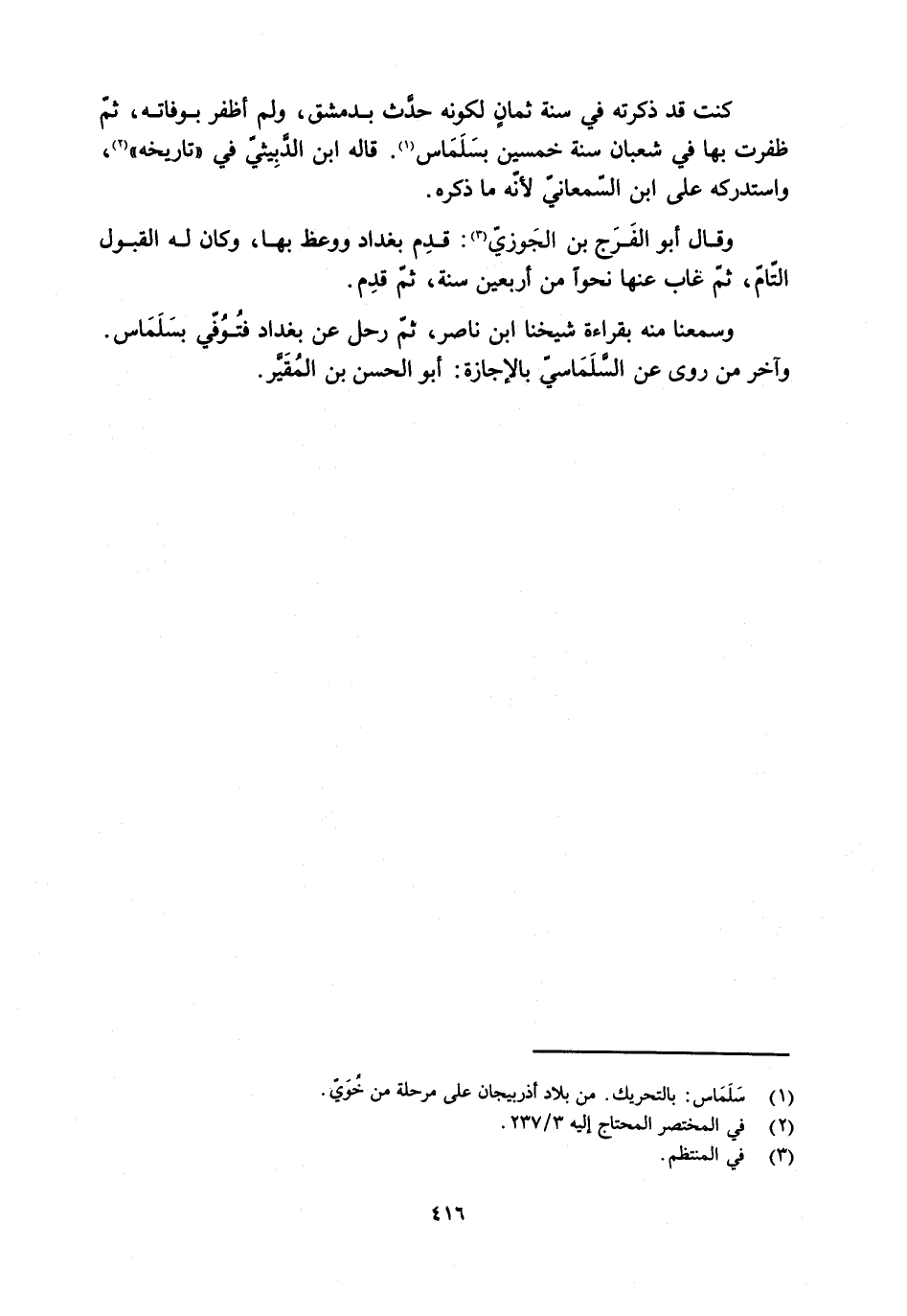 كنت قد ذكرته في سنة ثمانٍ لكونه حدَّث بدمشق، ولم أظفر بوفاته، ثمّ ظفرت بها في شعبان سنة خمسين بسَلَمَاس [1] . قاله ابن الدَّبِيثيّ في «تاريخه» [2] ، واستدركه عَلَى ابن السّمعانيّ لأنّه ما ذكره.