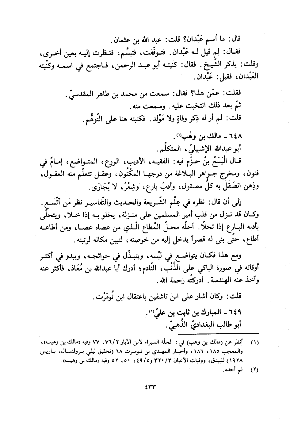 [1] انظر عن (مالك بن وهب) في: الحلّة السيراء لابن الأبار 2/ 76، 77 وفيه «مالك بن وهيب» ، والمعجب 185، 186، وأخبار المهدي بن تومرت 68 (تحقيق ليقي بروقنسال، باريس 1928) للبيدق، ووفيات الأعيان 3/ 320 و 5/ 49، 50، 52 وفيه «مالك بن وهيب» .