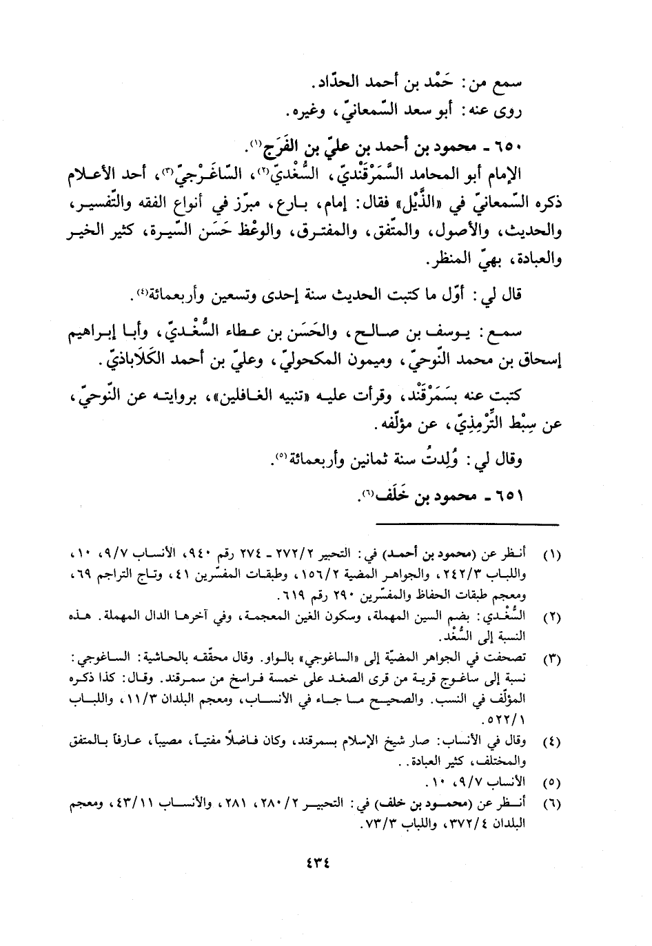 [1] انظر عن (محمود بن أحمد) في: التحبير 2/ 272- 274 رقم 940، والأنساب 7/ 9، 10، واللباب 3/ 242، والجواهر المضية 2/ 156، وطبقات المفسّرين 41، وتاج التراجم 69، ومعجم طبقات الحفاظ والمفسّرين 290 رقم 619.
