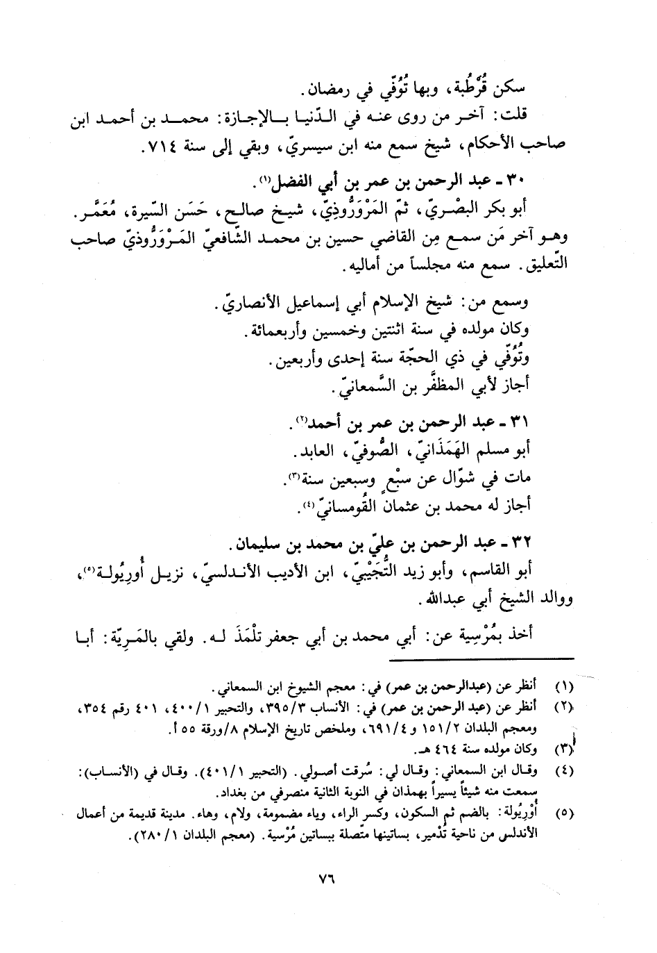 [2] انظر عن (عبد الرحمن بن عمر) في: الأنساب 3/ 395، والتحبير 1/ 400، 401 رقم 354، ومعجم البلدان 2/ 151، و 4/ 691، وملخص تاريخ الإسلام 8/ ورقة 55 أ.