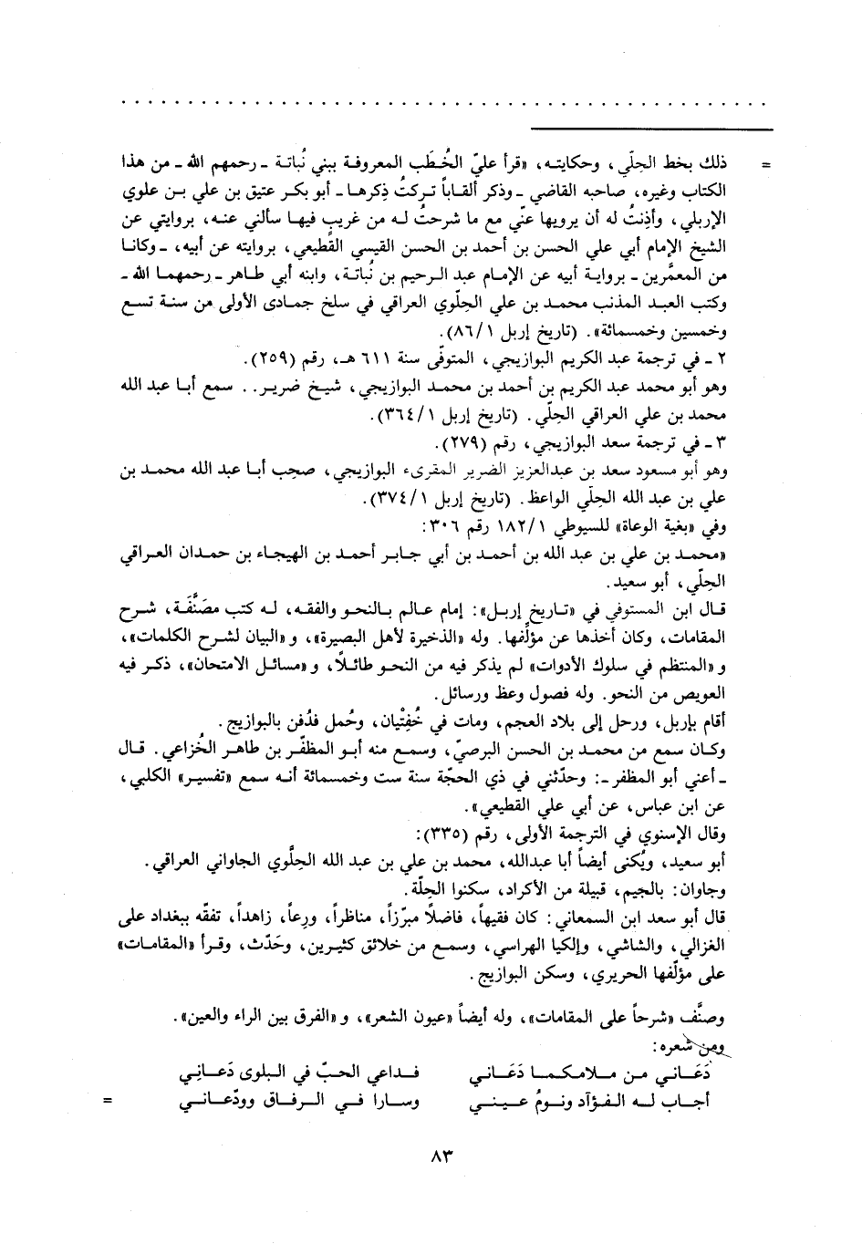 [ () ] ذلك بخط الحلّي، وحكايته، «قرأ عليّ الخطب المعروفة ببني نباتة- رحمهم الله- من هذا الكتاب وغيره، صاحبه القاضي- وذكر ألقابا تركت ذكرها- أبو بكر عتيق بن علي بن علوي الإربلي، وأذنت له أن يرويها عنّي مع ما شرحت له من غريب فيها سألني عنه، بروايتي عن الشيخ الإمام أبي علي الحسن بن أحمد بن الحسن القيسي القطيعي، بروايته عن أبيه، - وكانا من المعمّرين- برواية أبيه عن الإمام عبد الرحيم بن نباتة، وابنه أبي طاهر- رحمهما الله- وكتب العبد المذنب محمد بن علي الحلّوي العراقي في سلخ جمادى الأولى من سنة تسع وخمسين وخمسمائة» . (تاريخ إربل 1/ 86) .