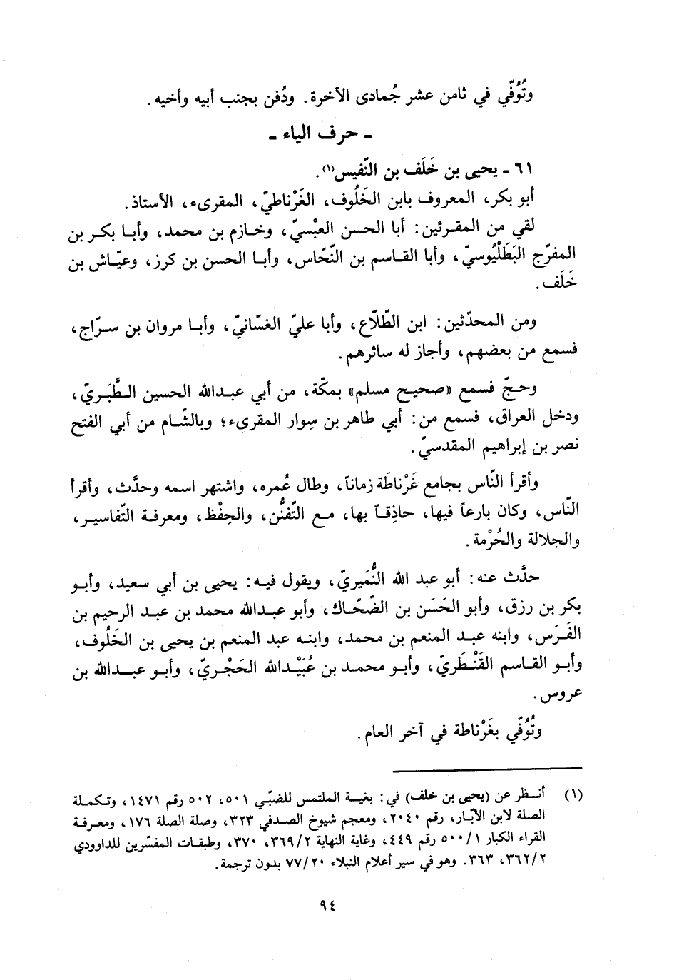 [1] انظر عن (يحيى بن خلف) في: بغية الملتمس للضبيّ 501، 502، رقم 1471، وتكملة الصلة لابن الأبّار، رقم 2040، ومعجم شيوخ الصدفي 323، وصلة الصلة 176، ومعرفة القراء الكبار 1/ 500 رقم 449، وغاية النهاية 2/ 369، 370، وطبقات المفسّرين للداوديّ 2/ 362، 363. وهو في سير أعلام النبلاء 20/ 77 بدون ترجمة.