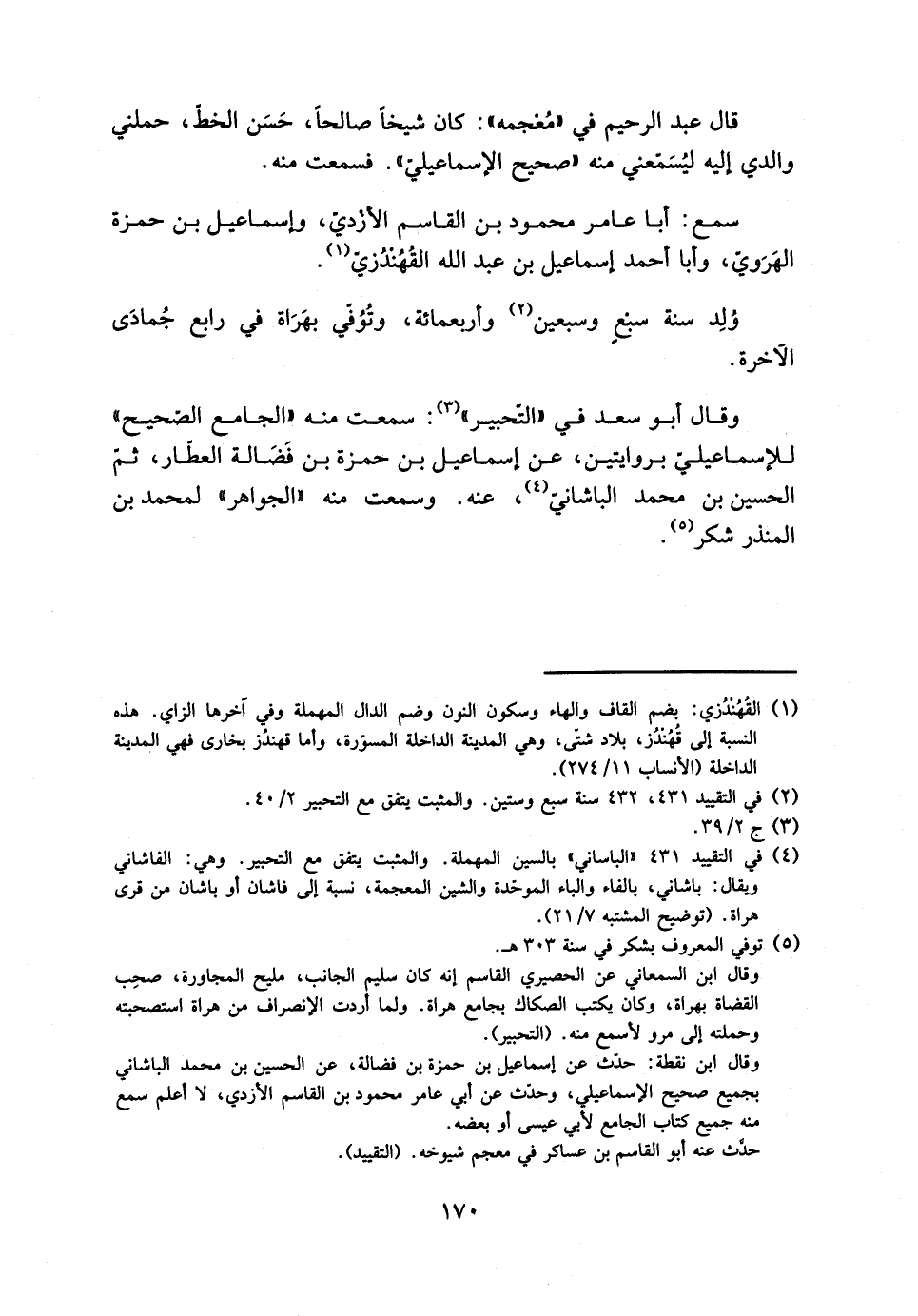 [4] في التقييد 431 «الباساني» بالسين المهملة. والمثبت يتفق مع التحبير. وهي: الفاشاني ويقال: باشاني، بالفاء والباء الموحّدة والشين المعجمة، نسبة إلى فاشان أو باشان من قرى هراة. (توضيح المشتبه 7/ 21) .