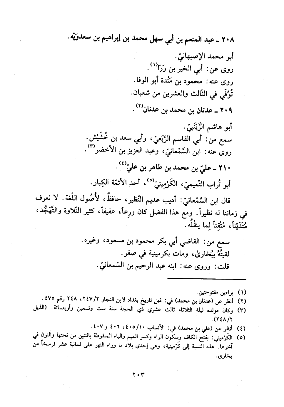 [5] الكرميني: بفتح الكاف وسكون الراء وكسر الميم والياء المنقوطة باثنتين من تحتها والنون في آخرها. هذه النسبة إلى كرمينية، وهي إحدى بلاد ما وراء النهر على ثمانية عشر فرسخا من بخارى.