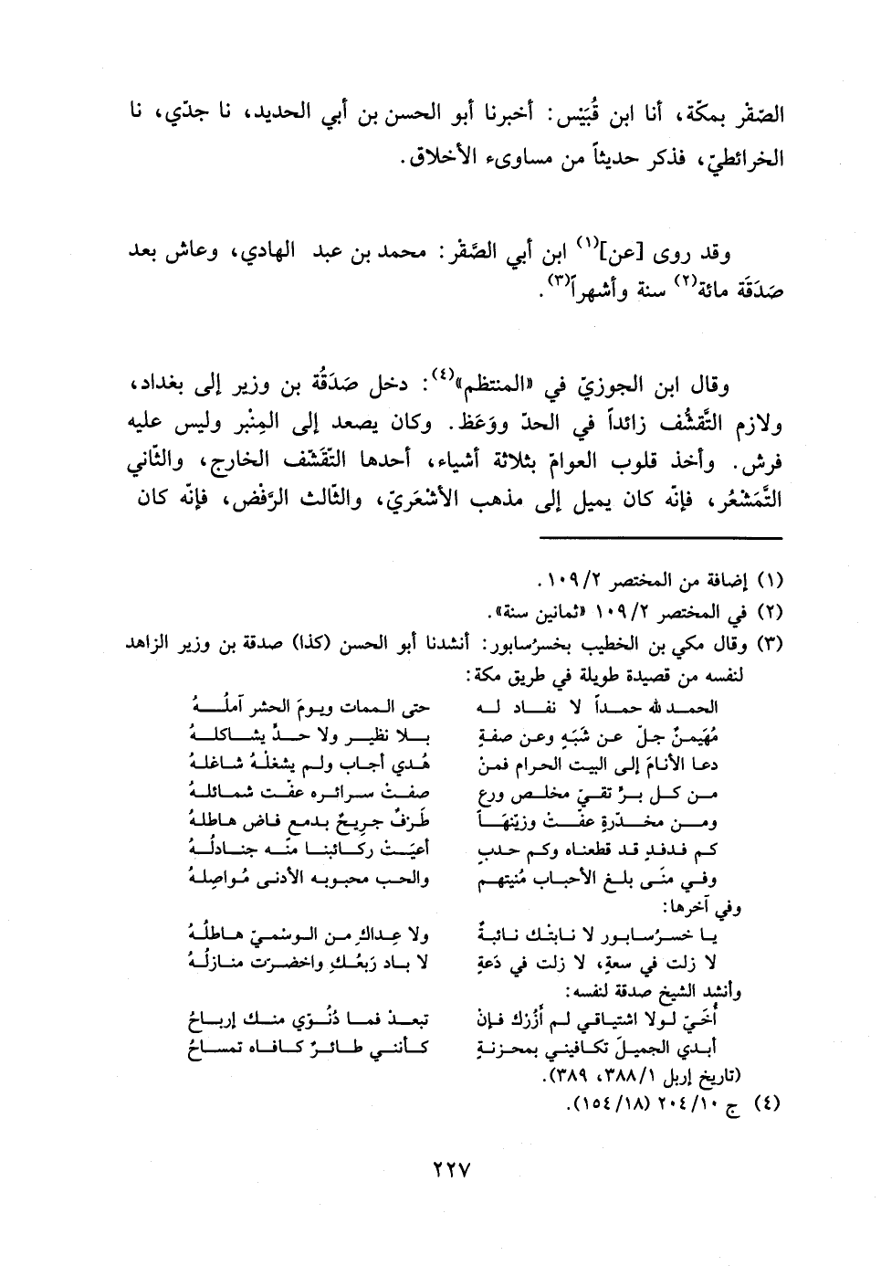 [3] وقال مكي بن الخطيب بخسرسابور: أنشدنا أبو الحسن (كذا) صدقة بن وزير الزاهد لنفسه من قصيدة طويلة في طريق مكة: