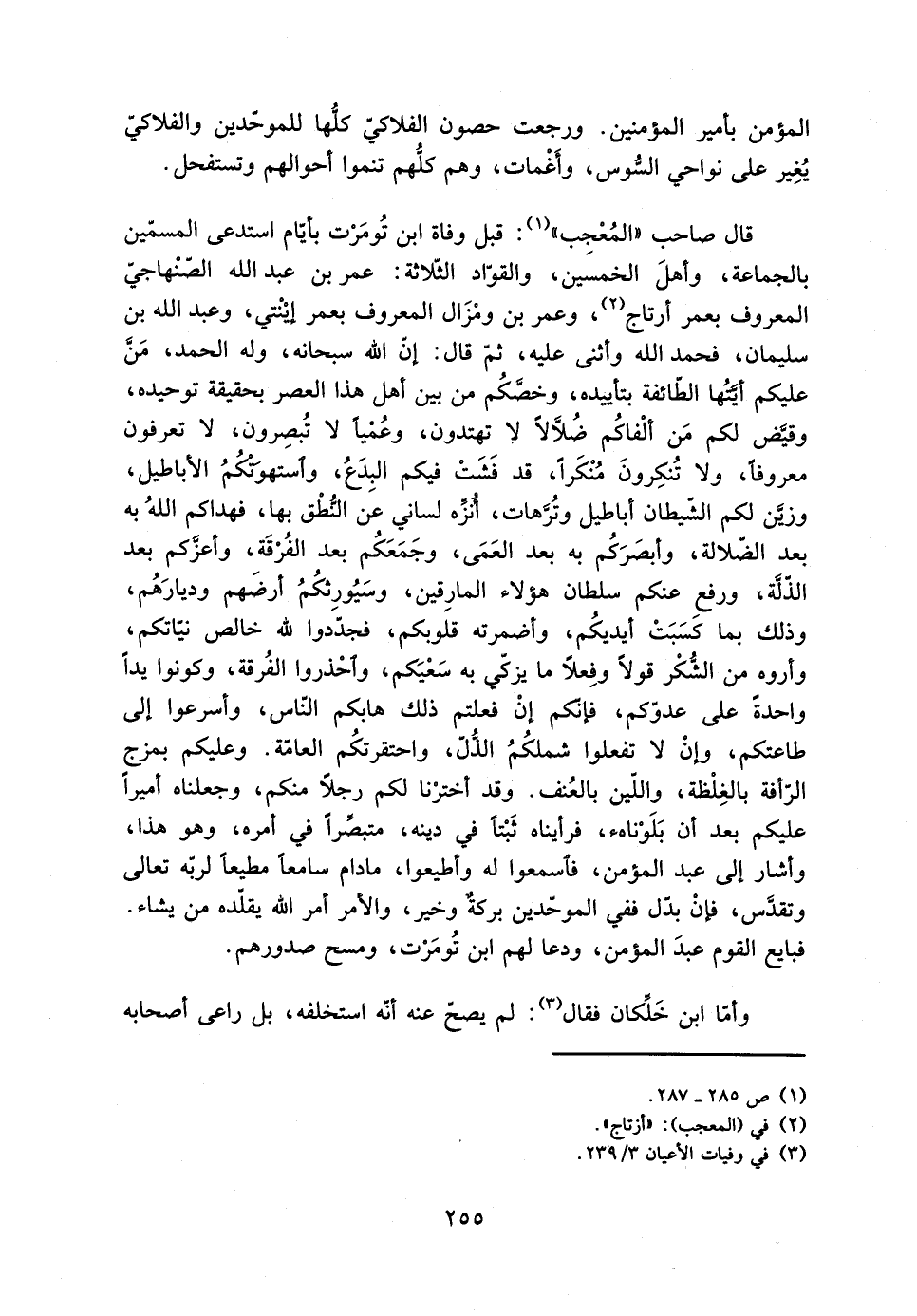 قال صاحب «المَعْجب» [1] : قبل وفاة ابن تُومَرْت بأيّام استدعى المسمّين بالجماعة، وأهلَ الخمسين، والقوّاد الثّلاثة: عُمَر بْن عَبْد اللَّه الصّنْهاجيّ المعروف بعمر أرتاج [2] ، وعمر بْن ومْزَال المعروف بعمر إينتي، وعبد اللَّه بْن سُلَيْمَان، فحمد اللَّهَ وَأَثْنَى عَلَيْهِ، ثُمَّ قَالَ: إِنَّ اللَّهَ سبحانه، وله الحمد، مَنَّ عليكم أيَّتُها الطّائفة بتأييده، وخصَّكم من بين أهل هذا العصر بحقيقة توحيده، وقيَّض لكم مَن ألْفاكم ضُلالا لا تهتدون، وعُمْيًا لا تُبْصِرون، لا تعرفون معروفا، ولا تُنكِرونُ مُنْكَرًا، قد فَشَتْ فيكم البِدَعُ، واستهوَتْكُمُ الأباطيل، وزَّين لكم الشّيطان أباطيل وتُرَّهات، أُنزِّه لساني عن النُّطْق بها، فهداكم اللَّه به بعد الضّلالة، وأبصَرَكُم به بعد العَمَى، وجَمَعَكُم بعد الفُرْقَة، وأعزَّكم بعد الذّلَّة، ورفع عنكم سلطان هؤلاء المارِقين، وسِيُورِثكُمُ أرضَهم وديارَهُم، وذلك بما كَسَبَت أيديكُم، وأضمرته قلوبكم، فجدّدوا للَّه خالص نيّاتكم، وأروه من الشُّكْر قولا وفِعلًا ما يزكّي به سَعْيَكُمْ، واحذروا الفُرقة، وكونوا يدا واحدة على عدوّكم، فإنّكم إنْ فعلتم ذلك هابكم النّاس، وأسرعوا إلى طاعتكم، وإنْ لا تفعلوا شملكُمُ الذُّلُ، واحتقرتكُم العامَّة. وعليكم بمزج الرّأفة بالغِلْظة، واللّين بالعُنف. وقد اخترنا لكم رجلا منكم، وجعلناه أميرا عليكم بعد أن بَلَوْنَاه، فرأيناه ثَبْتًا فِي دينه، متبِّصرًا فِي أمره، وهو هذا، وأشار إلى عبد المؤمن، فاسمعوا له وأطيعوا، ما دام سامعا مطيعا لربّه تعالى وتقدَّس، فإنْ بدّل ففي الموحّدين بركةٌ وخير، والأمر أمر اللَّه يقلّده من يشاء.