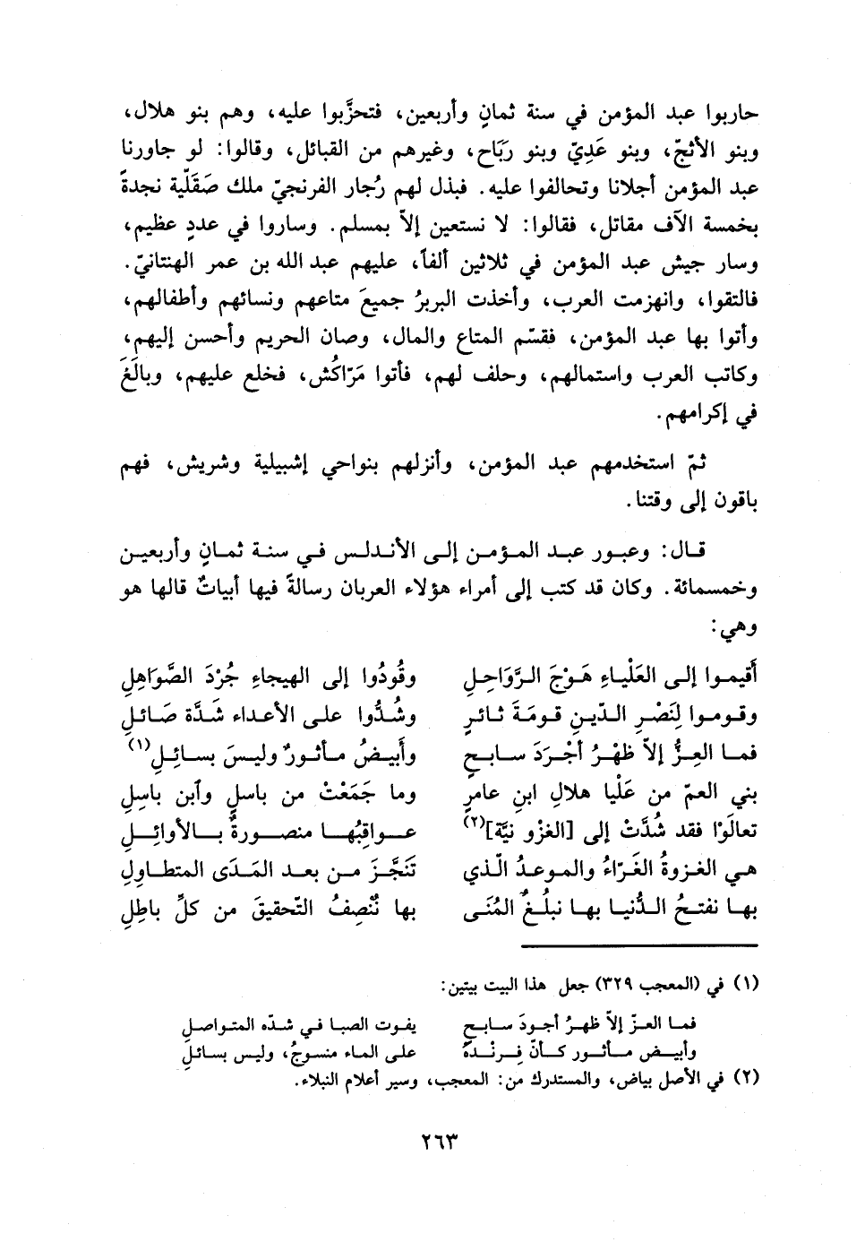 قال: وعبور عَبْد المؤمن إلى الأندلس فِي سنة ثمان وأربعين وخمسمائة. وكان قد كتب إلى أمراء هؤلاء العربان رسالة فيها أبياتٌ قالها هُوَ وهي: