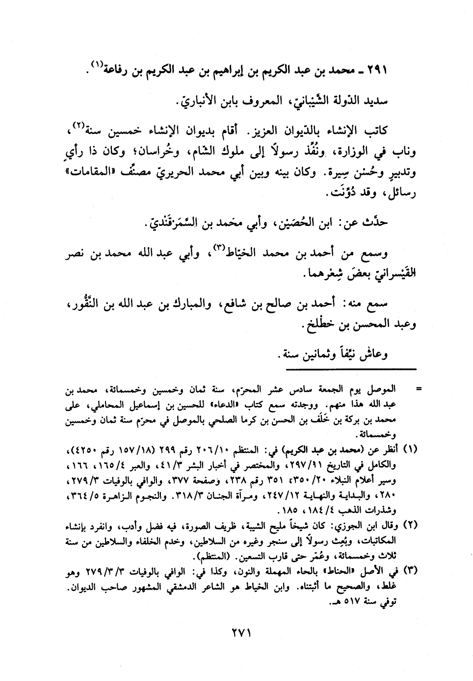 [1] انظر عن (محمد بن عبد الكريم) في: المنتظم 10/ 206 رقم 299 (18/ 157 رقم 4250) ، والكامل في التاريخ 11/ 297، والمختصر في أخبار البشر 3/ 41، والعبر 4/ 165، 166، وسير أعلام النبلاء 20/ 350، 351 رقم 238، وصفحة 377، والوافي بالوفيات 3/ 279، 280، والبداية والنهاية 12/ 247، ومرآة الجنان 3/ 318. والنجوم الزاهرة 5/ 364، وشذرات الذهب 4/ 184، 185.
