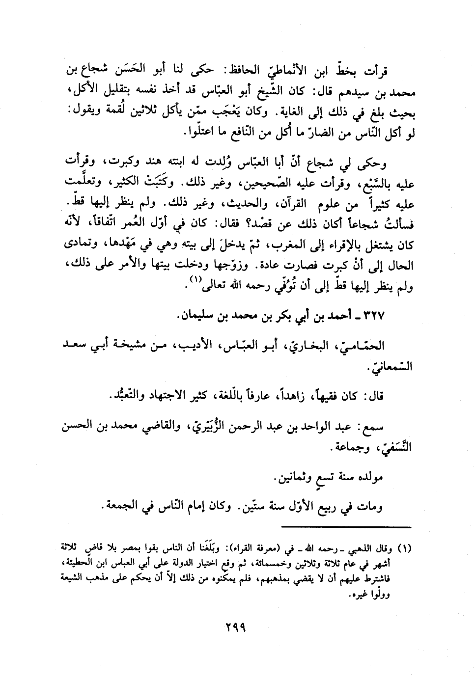 فسألتُ شجاعا أكان ذلك عن قصْد؟ فقال: كان فِي أوّل العُمر اتّفاقا، لأنّه كان يشتغل بالإقراء إلى المغرب، ثُمَّ يدخل إلى بيته وهي فِي مَهْدها، وتمادى الحال إلى أنْ كبرت فصارت عادة. وزوّجها ودخلت بيتها والأمر على ذلك، ولم ينظر إليها قَطّ إلى أن تُوُفّي رحمه اللَّه تعالى [1] .