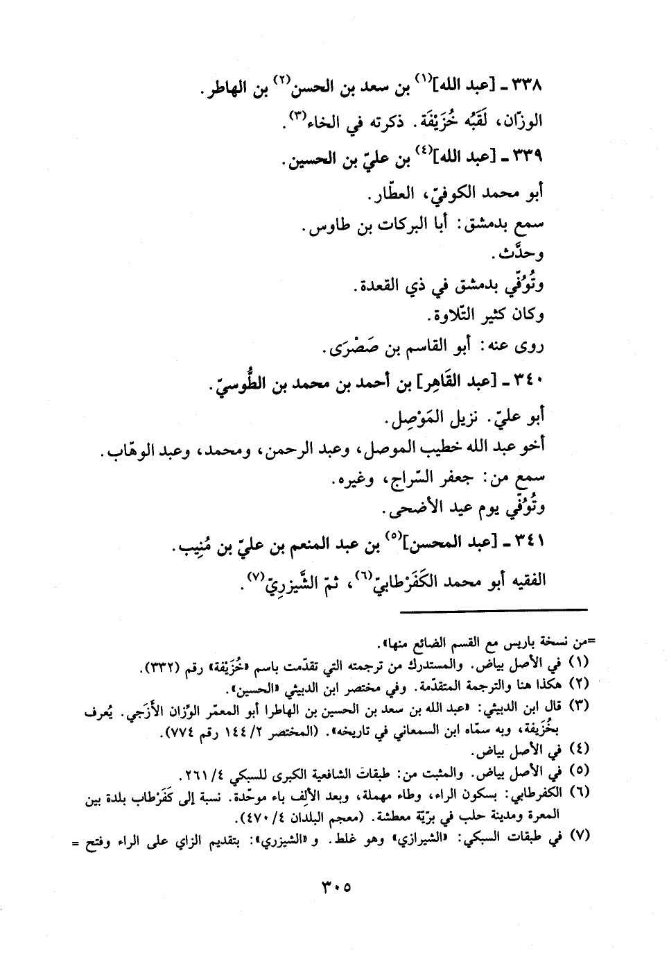 [3] قال ابن الدبيثي: «عبد الله بن سعد بن الحسين بن الهاطرا أبو المعمّر الوزّان الأزجي. يعرف بخزيفة، وبه سمّاه ابن السمعاني في تاريخه» . (المختصر 2/ 144 رقم 774) .
