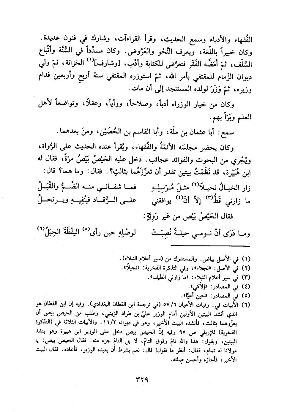 وكان خبيرا باللّغة، ويعرف النّحو والعروض. وكان مسدّدا في السّنّة واتّباع السّلف، ثمّ أمضّه الفقر فتعرّض للكتابة وأدّب، [وشارف] [1] الخزانة، ثمّ ولي ديوان الزّمام للمقتفي بأمر الله، ثمّ استوزره المقتفي سنة أربع وأربعين فدام وزيره، ثمّ وزر لولده المستنجد إلى أن مات.