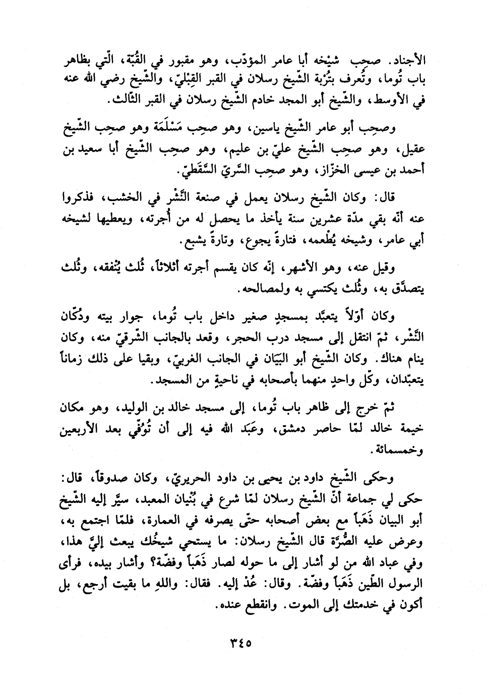 الأجناد. صحِب شيْخه أَبَا عامر المؤدِّب، وهو مقبور فِي القُبة، الّتي بظاهر باب تُوما، وتُعرف بتُرْبة الشَّيْخ رسلان فِي القبر القِبْليّ، والشّيخ رَضِيَ اللَّه عَنْهُ فِي الأوسط، والشّيخ أبو المجد خادم الشَّيْخ رسلان فِي القبر الثّالث.