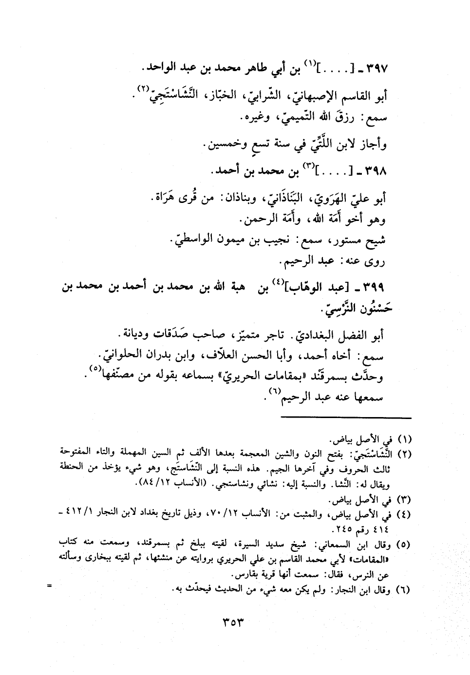 399-[عَبْد الوهّاب] [4] بْن هِبَة اللَّه بْن مُحَمَّد بْن أَحْمَد بْن مُحَمَّد بْن حَسْنُونَ النَّرْسِيّ.