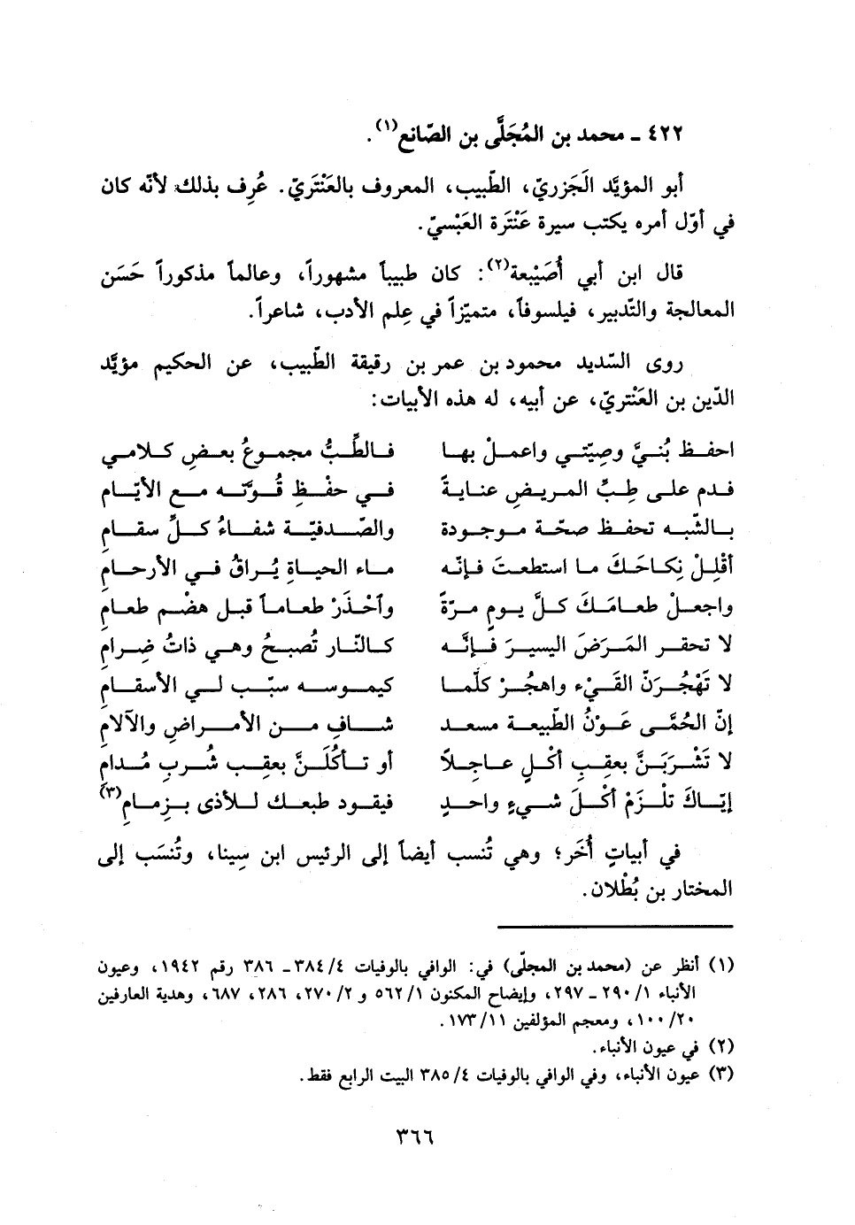 [1] انظر عن (محمد بن المجلّى) في: الوافي بالوفيات 4/ 384- 386 رقم 1942، وعيون الأنباء 1/ 290- 297، وإيضاح المكنون 1/ 562 و 2/ 270، 286، 687، وهدية العارفين 20/ 100، ومعجم المؤلفين 11/ 173.