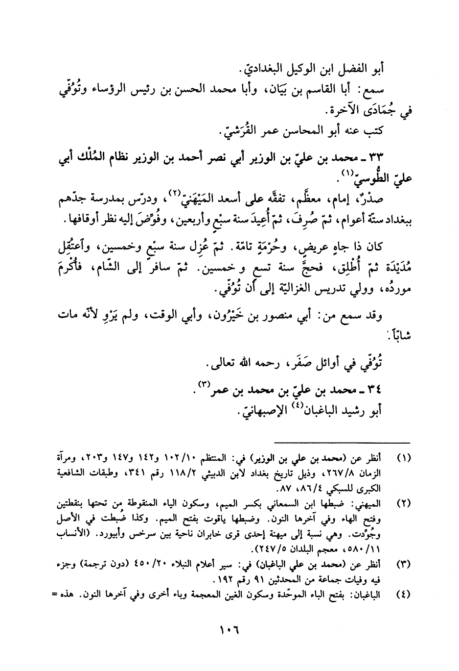 [1] انظر عن (محمد بن علي بن الوزير) في: المنتظم 10/ 102 و 142 و 147 و 203، ومرآة الزمان 8/ 267، وذيل تاريخ بغداد لابن الدبيثي 2/ 118 رقم 341، وطبقات الشافعية الكبرى للسبكي 4/ 86، 87.
