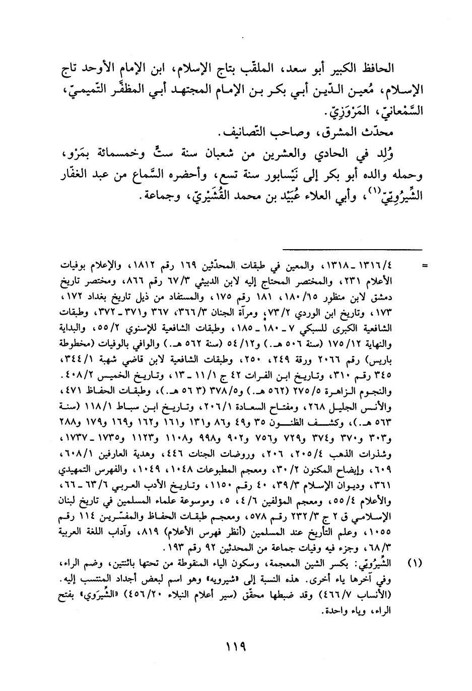[4] / 1316- 1318، والمعين في طبقات المحدّثين 169 رقم 1812، والإعلام بوفيات الأعلام 231، والمختصر المحتاج إليه لابن الدبيثي 3/ 67 رقم 866، ومختصر تاريخ دمشق لابن منظور 15/ 180، 181 رقم 175، والمستفاد من ذيل تاريخ بغداد 172، 173، وتاريخ ابن الوردي 2/ 73، ومرآة الجنان 3/ 366، 367 و 371- 372، وطبقات الشافعية الكبرى للسبكي 7- 180- 185، وطبقات الشافعية للإسنويّ 2/ 55، والبداية والنهاية 12/ 175 (سنة 506 هـ.) و 12/ 54 (سنة 562 هـ.) والوافي بالوفيات (مخطوطة باريس) رقم 2066 ورقة 249، 250، وطبقات الشافعية لابن قاضي شهبة 1/ 344، 345 رقم 310، وتاريخ ابن الفرات 42 ج 1/ 11- 13، وتاريخ الخميس 2/ 408.