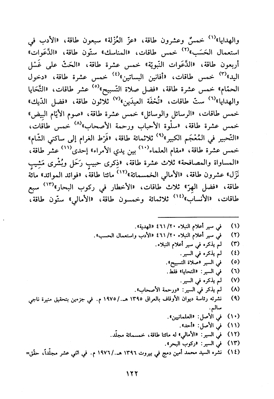 والهدايا» [1] خمسٌ وعشرون طاقة، «عزّ العُزْلة» سبعون طاقة، «الأدب فِي استعمال الحَسَب» [2] خمس طاقات، «المناسك» ستّون طاقة، «الدَّعَوات» أربعون طاقة، «الدَّعَوات النّبويَّة» خمس عشرة طاقة، «الحَثّ عَلَى غَسْلِ اليد» [3] خمس طاقات، «أفانين البساتين» [4] خمس عشرة طاقة، «دخول الحمّام» خمس عشرة طاقة، «فضل صلاة التّسبيح» [5] عشر طاقات، «التَّحَايا والهدايا» [6] ستّ طاقات، «تُحْفَة العيدَين» [7] ثلاثون طاقة، «فضل الدّيك» خمس طاقات، «الرسائل والوسائل» خمس عشرة طاقة، «صوم الأيّام البِيض» خمس عشرة طاقة، «سلْوة الأحباب ورحمة الأصحاب» [8] خمس طاقات، «التّحبير فِي المعجم الكبير» [9] ثلاثمائة طاقة، «فَرْط الغرام إلى ساكني الشّام» خمس عشرة طاقة، «مقام العلماء [10] بين يدي الأمراء» إحدى [11] عشر طاقة، «المساواة والمصافحة» ثلاث عشرة طاقة، «ذِكرى حبيبٍ رَحَل وبُشْرى مَشِيبٍ نَزَل» عشرون طاقة، «الأمالي الخمسمائة» [12] مائتا طاقة، «فوائد الموائد» مائة طاقة، «فضل الهِرّ» ثلاث طاقات، «الأخطار فِي ركوب البحار» [13] سبع طاقات، «الأنساب» [14] ثلاثمائة وخمسون طاقة، «الأمالي» ستّون طاقة،