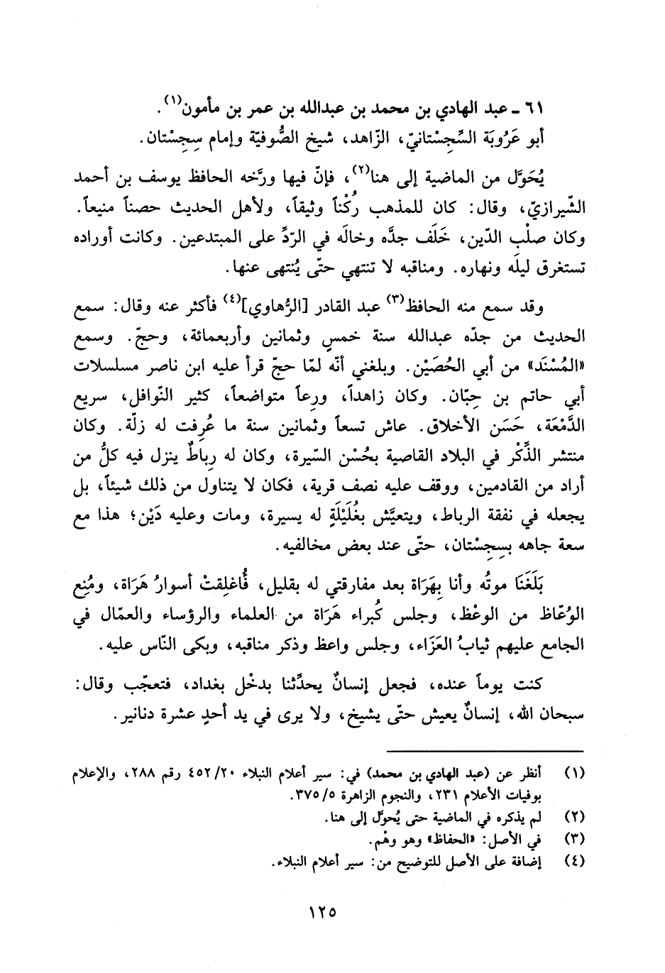 وقد سَمِعَ منه الحافظ [3] عَبْد القادر [الرُّهاوي] [4] فأكثر عَنْهُ وقال: سَمِعَ الحديث من جدّه عَبْد الله سنة خمس وثمانين وأربعمائة، وحجّ. وسمع «المُسْنَد» من أَبِي الحُصَيْن. وبلغني أَنَّهُ لمّا حجّ قرأ عَلَيْهِ ابن ناصر مسلسلات أَبِي حاتم بْن حِبّان. وكان زاهدا، ورِعًا متواضعا، كثير النّوافل، سريع الدَّمْعَة، حَسَن الأخلاق. عاش تسعا وثمانين سنة ما عُرِفت لَهُ زلَّة. وكان منتشر الذِّكْر فِي البلاد القاصية بحُسْن السّيرة، وكان لَهُ رِباطٌ ينزل فِيهِ كلُّ من أراد من القادمين، ووقف عَلَيْهِ نصف قرية، فكان لا يتناول من ذَلِكَ شيئا، بل يجعله فِي نفقة الرباط، ويتعيَّش بغُلَيْلَةٍ لَهُ يسيرة، ومات وعليه دَيْن، هذا مَعَ سعة جاهه بسِجِسْتان، حتّى عند بعض مخالفيه.