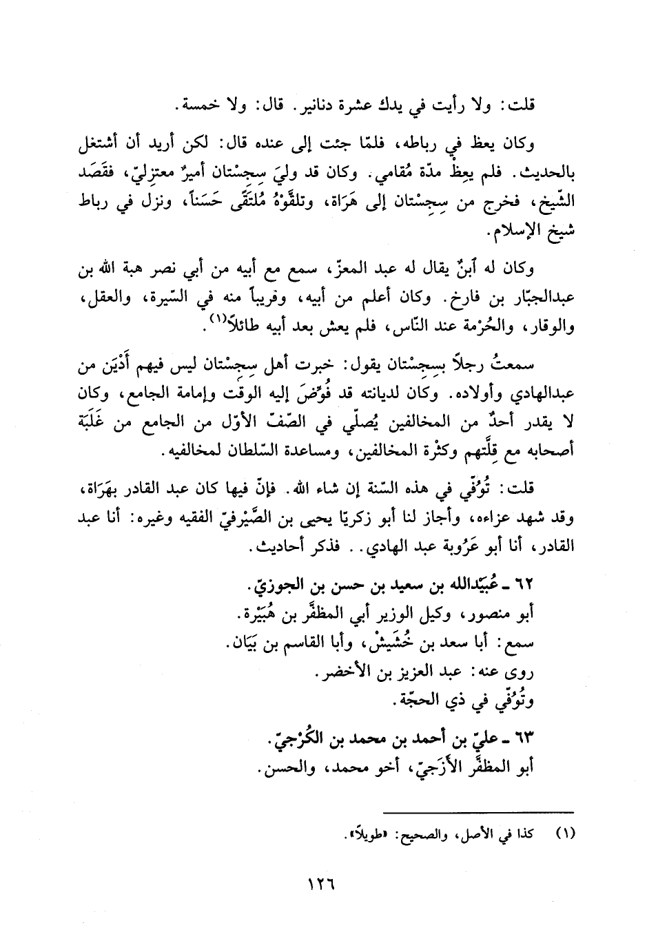 قلت: تُوُفّي فِي هذه السّنة إن شاء اللَّه. فإنّ فيها كَانَ عَبْد القادر بهَرَاة، وقد شهد عزاءه، وأجاز لنا أبو زكريّا يحيى بن الصَّيْرفيّ الفقيه وغيره: أنا عَبْد القادر، أنا أبو عَرُوبة عَبْد الهادي.. فذكر أحاديث.