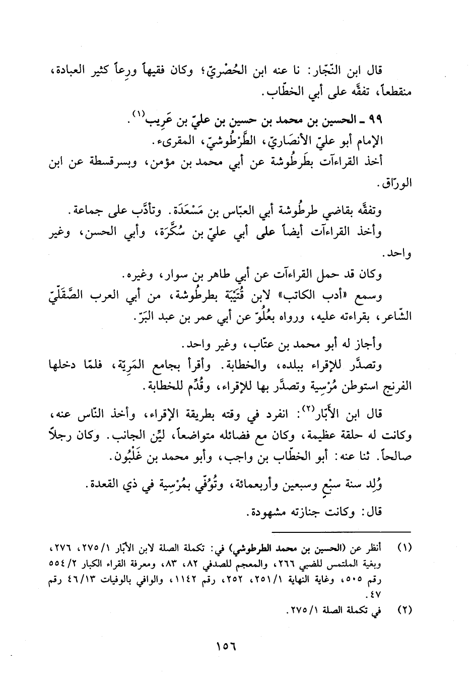 [1] انظر عن (الحسين بن محمد الطرطوشي) في: تكملة الصلة لابن الأبّار 1/ 275، 276، وبغية الملتمس للضبي 266، والمعجم للصدفي 82، 83، ومعرفة القراء الكبار 2/ 554 رقم 505، وغاية النهاية 1/ 251، 252، رقم 1142، والوافي بالوفيات 13/ 46 رقم 47.