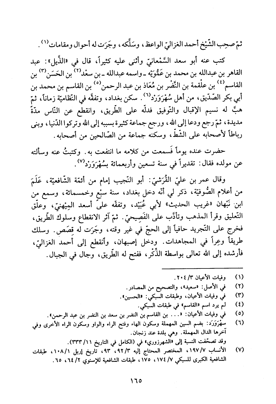 وقال عُمَر بْن عليّ الْقُرَشِيّ: أَبُو النّجيب إمام من أئمَّة الشّافعيَّة، عَلَمٌ من أعلام الصُّوفيَّة، ذكر لي أَنَّهُ دخل بغداد، سنة سبع وخمسمائة، وسمع من ابن نَبْهان «غريب الحديث» لأبي عُبَيْد، وتفقّه عَلَى أسعد المِيهنيّ، وعلّق التّعليق وقرأ المذهب وتأدَّب عَلَى الفَصِيحيّ. ثمّ آثر الانقطاع وسلوك الطّريق، فخرج عَلَى التّجريد حافيا إلى الحجّ فِي غير وقته، وجَرَت لَهُ قِصَص. وسلك طريقا وَعِرًا فِي المجاهدات. ودخل أصبهان، وانقطع إلى أحمد الغزاليّ، فأرشده إلى اللَّه تعالى بواسطة الذَّكْر، ففتح لَهُ الطّريق، وجال في الجبال.