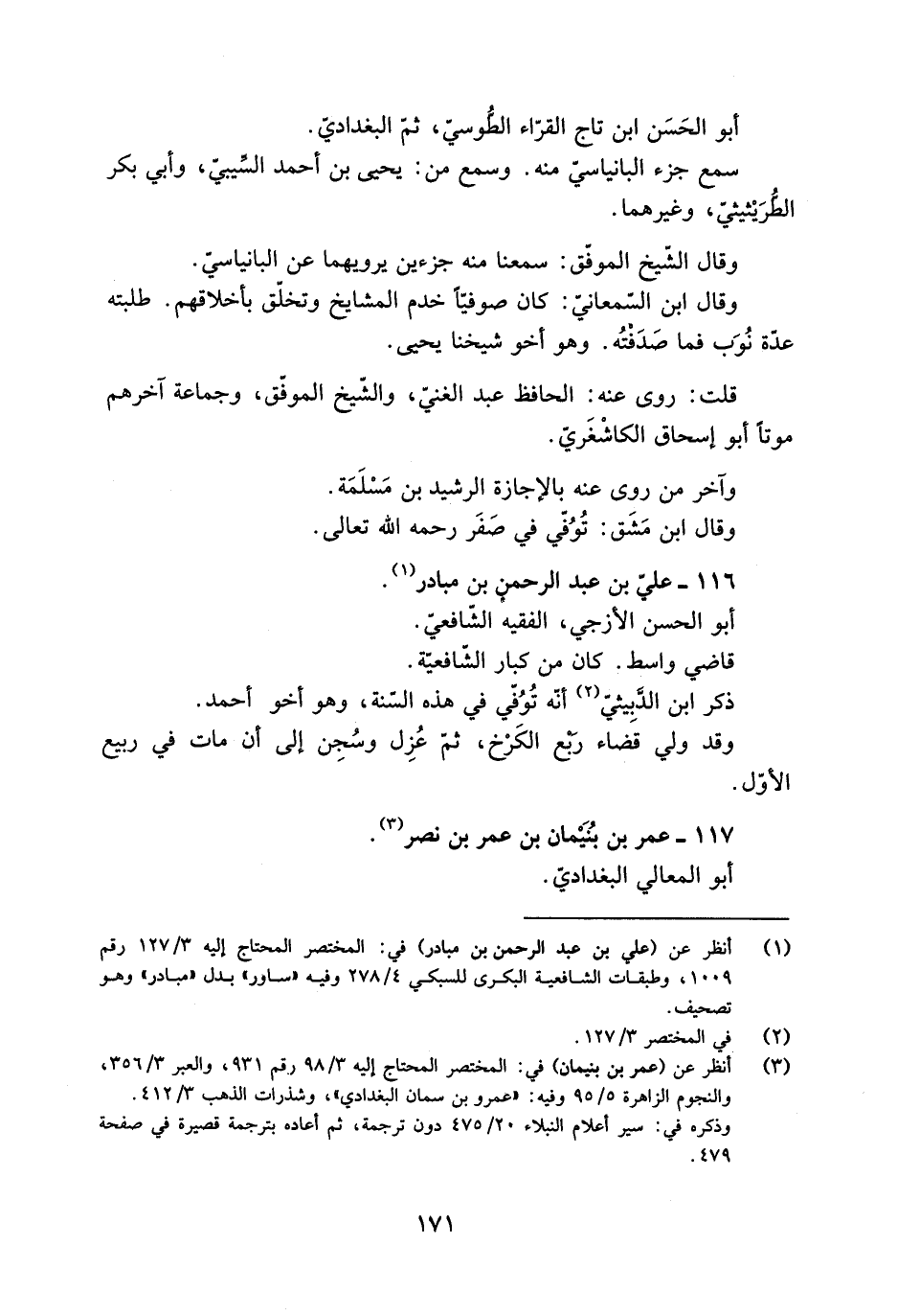 [3] انظر عن (عمر بن بنيمان) في: المختصر المحتاج إليه 3/ 98 رقم 931، والعبر 3/ 356، والنجوم الزاهرة 5/ 95 وفيه: «عمرو بن سمان البغداديّ» ، وشذرات الذهب 3/ 412.